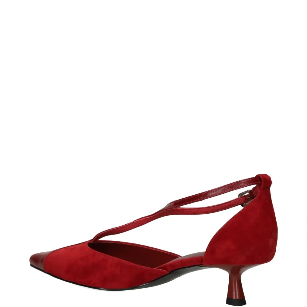 красные туфли с ремешком в форме буквы Т, заостренным носком, застежкой-пряжкой, на шпильке, верх из кожи