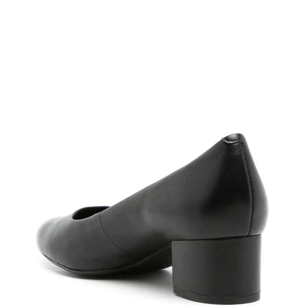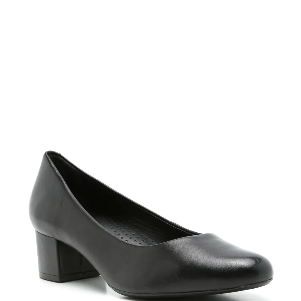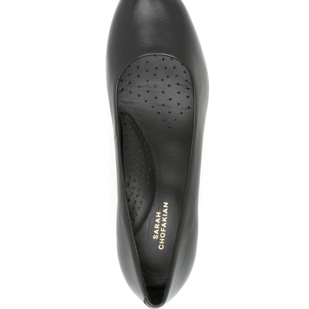 Черный, кожа, миндалевидный носок, модель без застежки, стелька с логотипом, низкий блочный каблук и кожаная подошва.