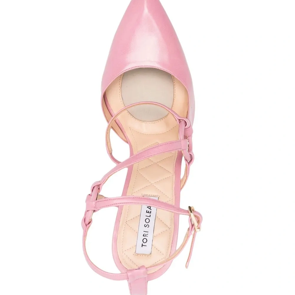 Светло-розовый, телячья кожа, металлические кольца, заостренный носок, ремешок на щиколотке с пряжкой, высокий каблук и кожаная подошва.