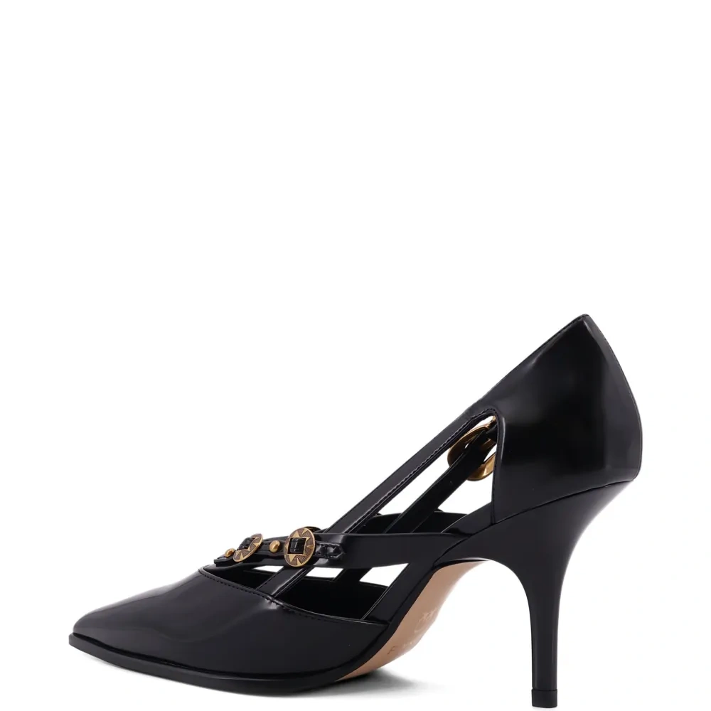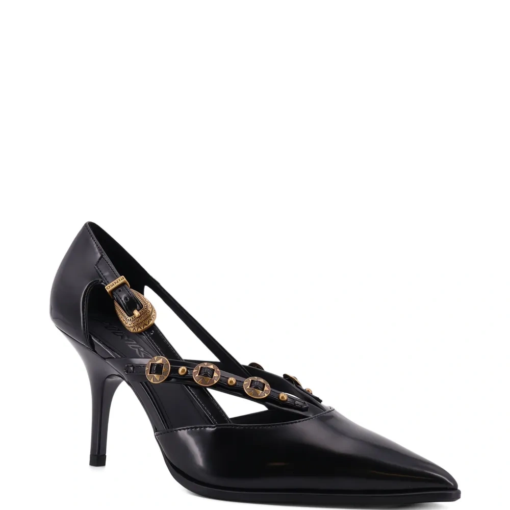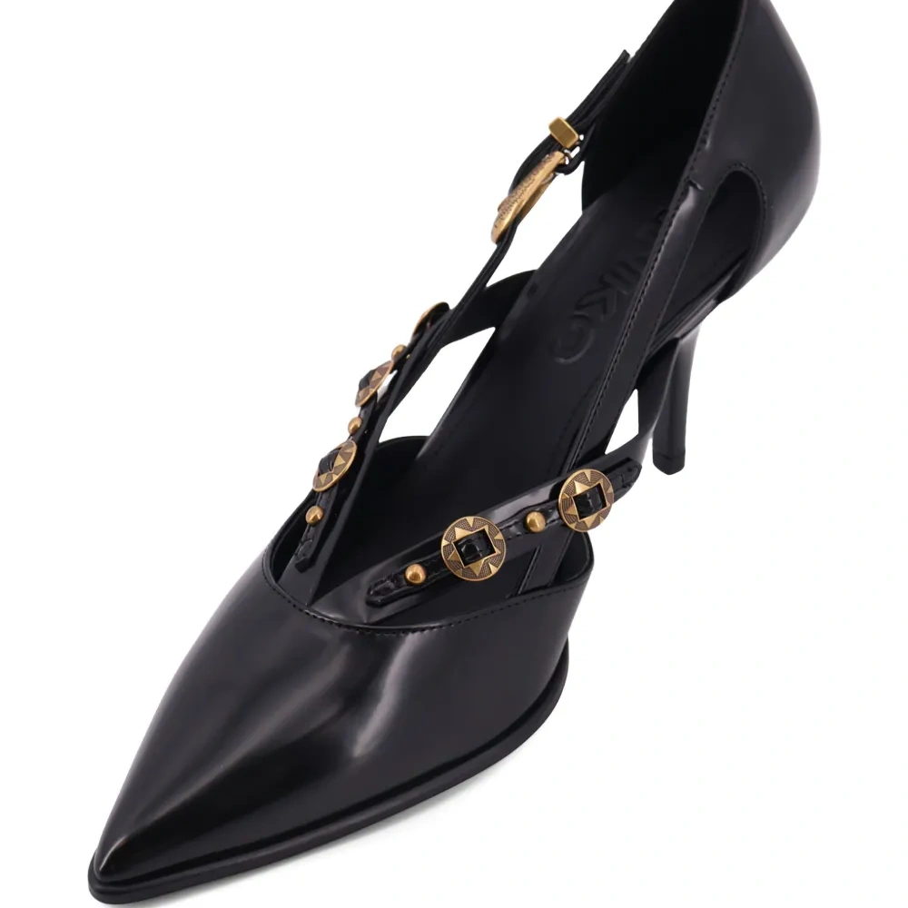 черные туфли с фурнитурой золотистого оттенка, заостренным носком, шпилькой, с вырезами и ремешком, украшенным пряжкой