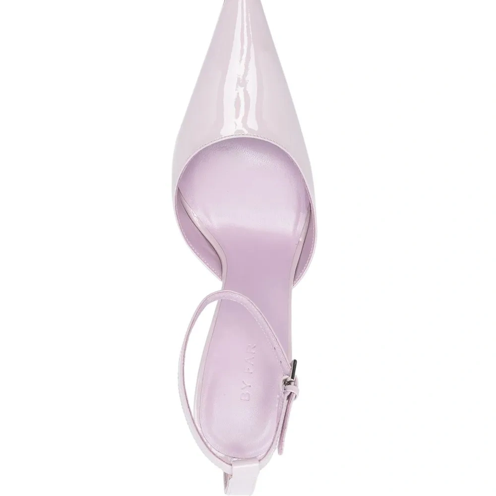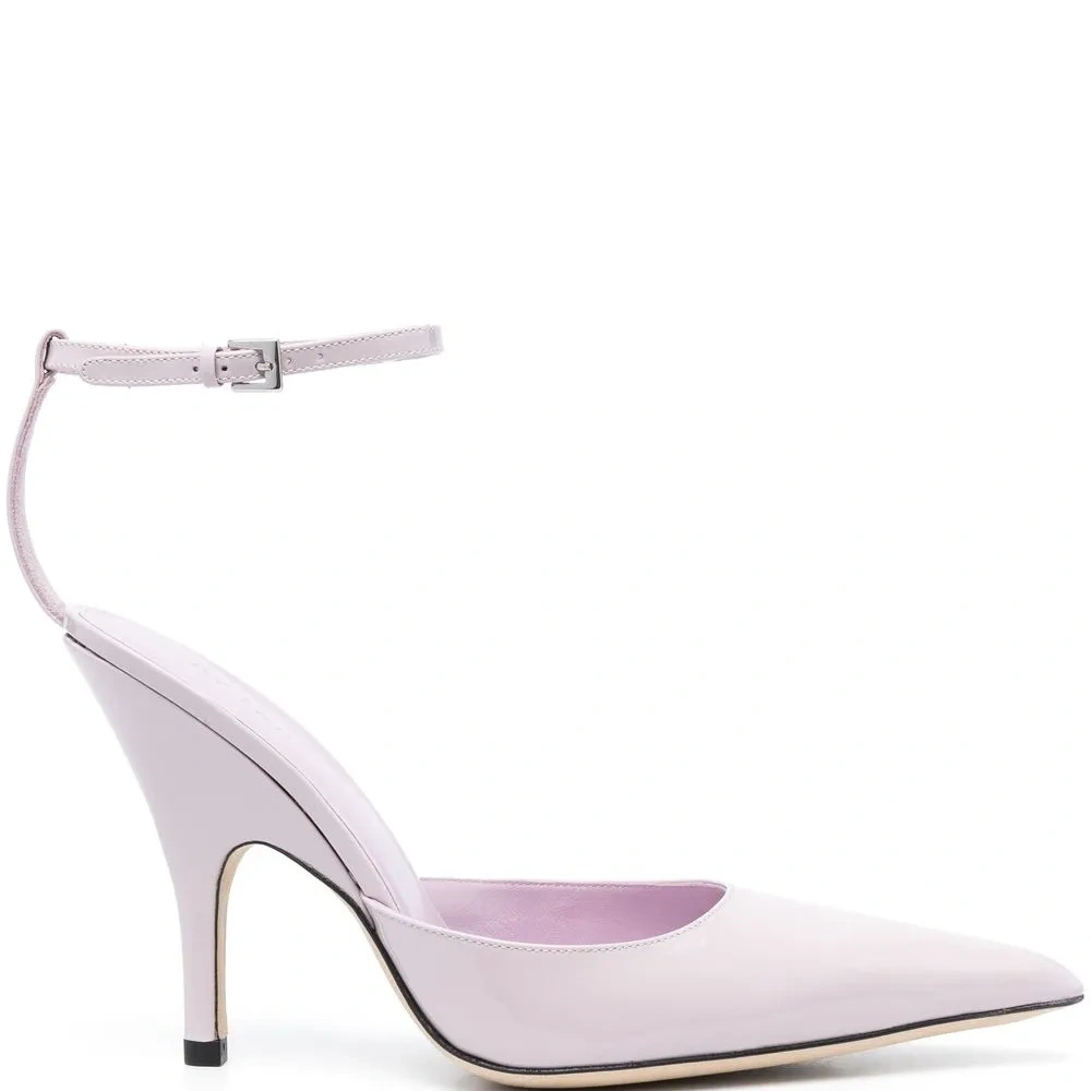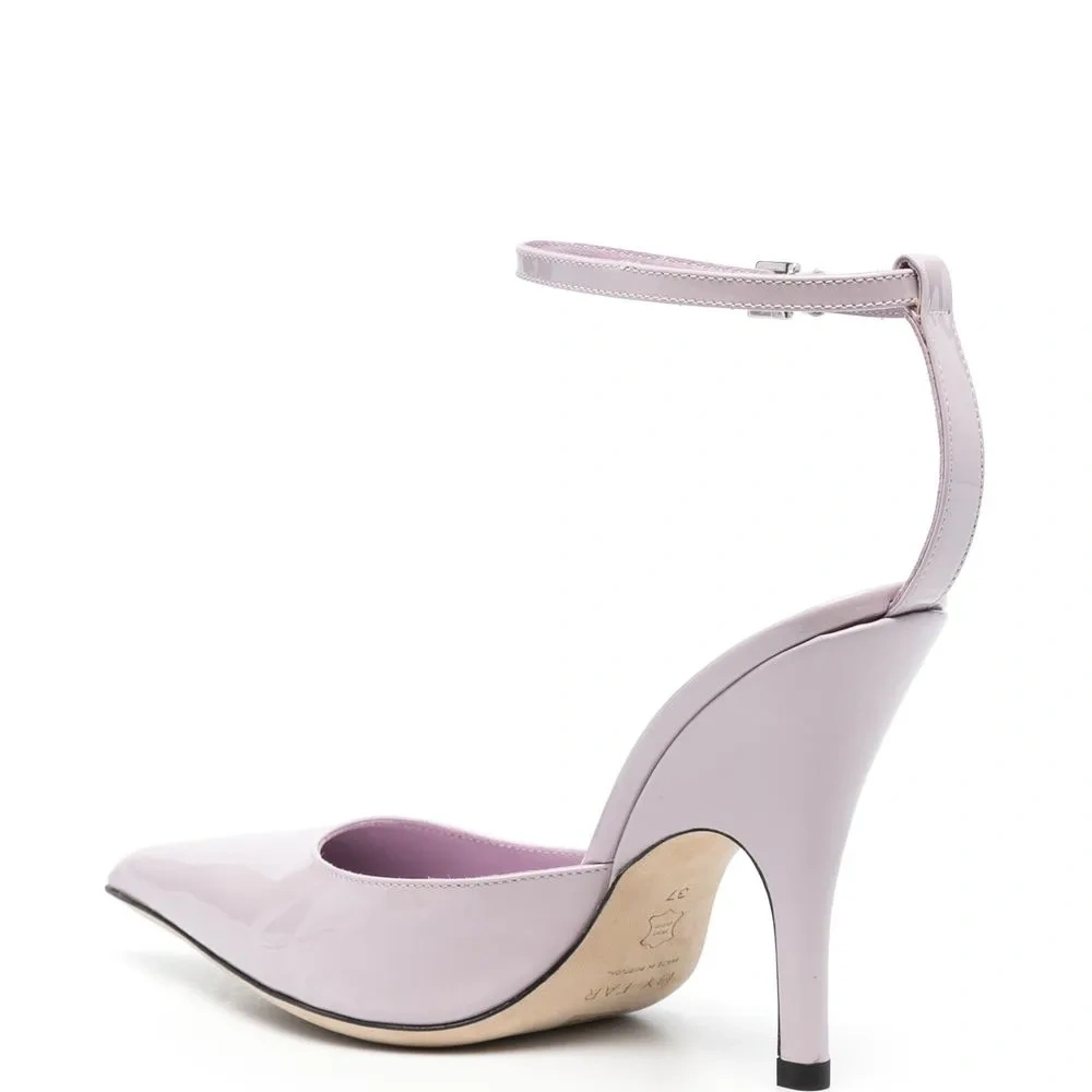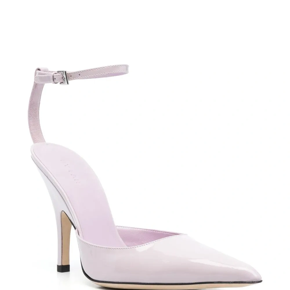 Лиловый, телячья кожа, лакированная отделка, заостренный носок, ремешок на щиколотке с пряжкой, высокий каблук и стелька с логотипом.
