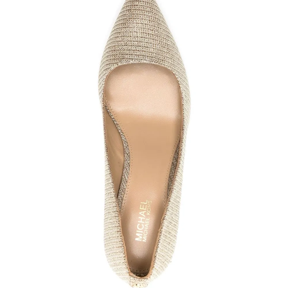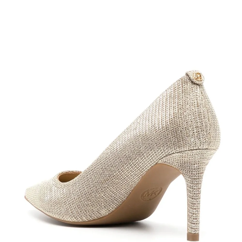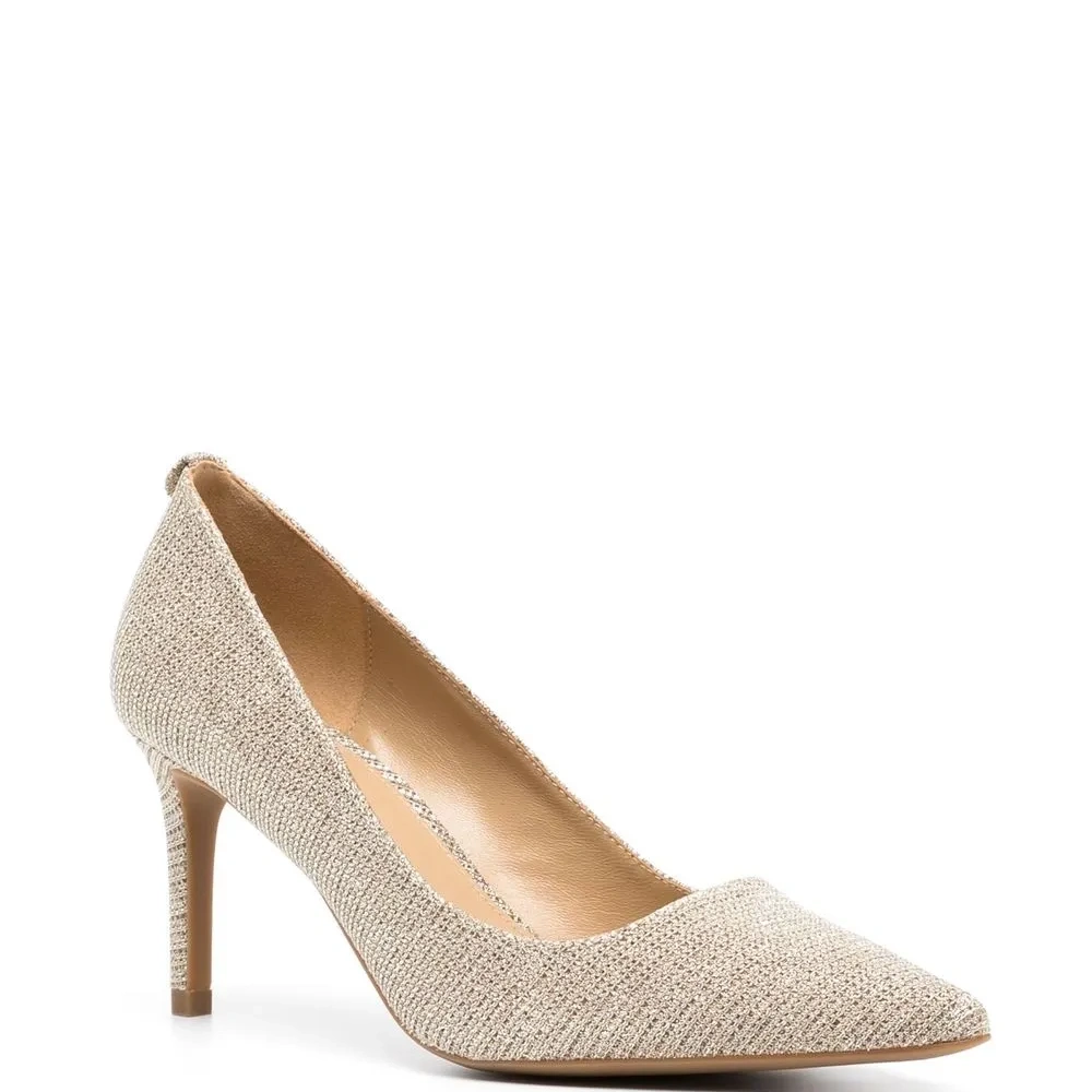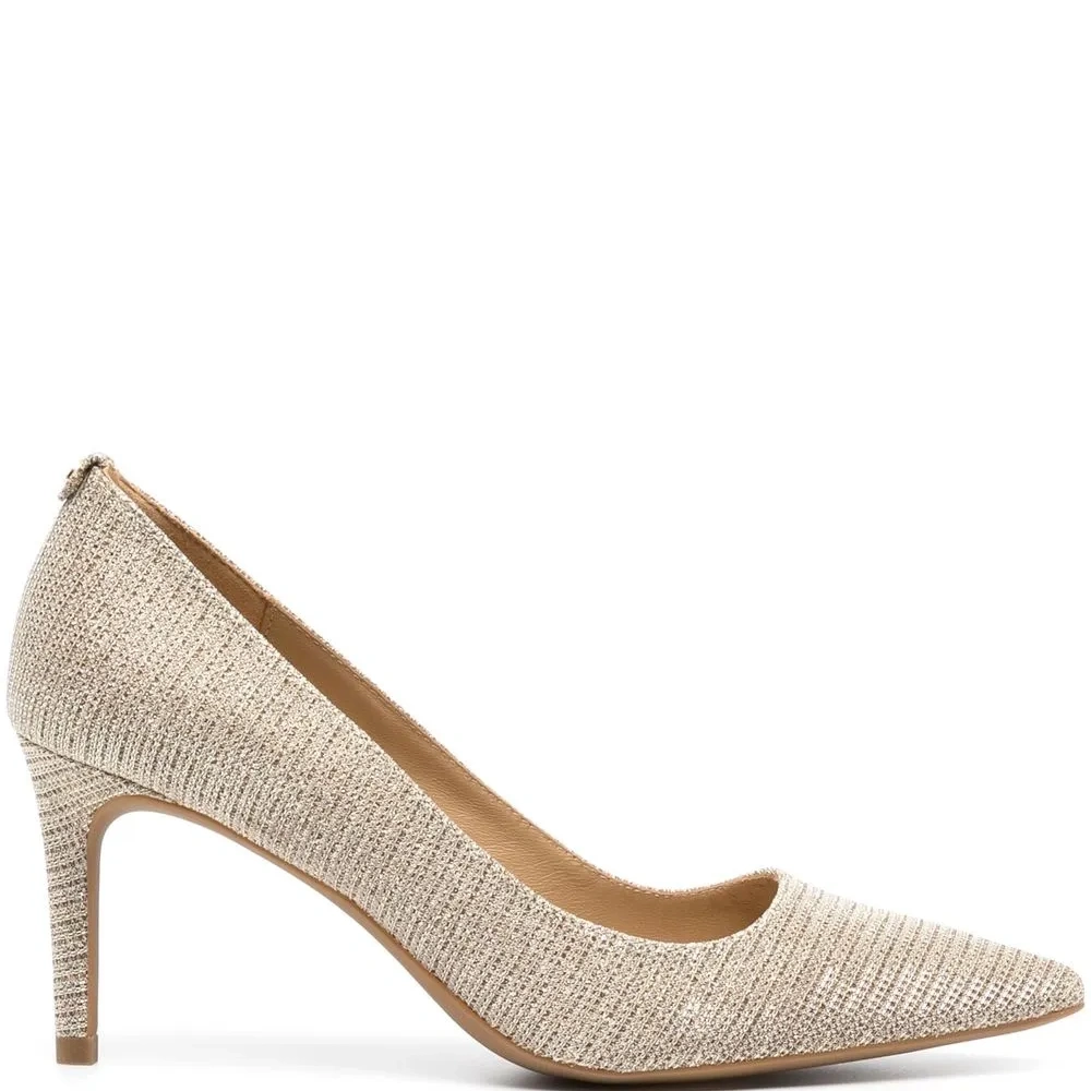 Золотистый, телячья кожа, покрытие с эффектом металлик, заостренный носок, каблук-шпилька и модель без застежки.