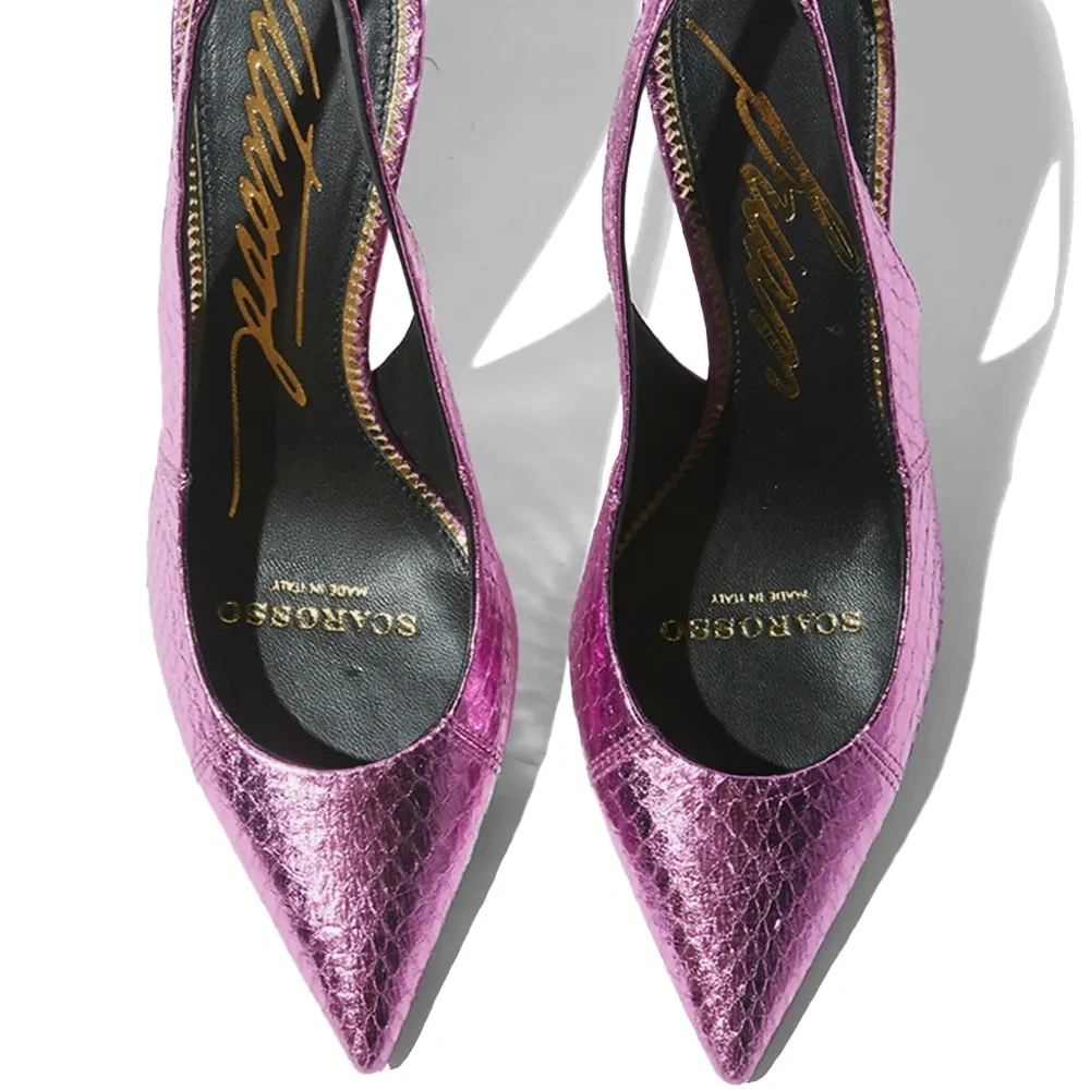 Фуксия, телячья кожа, эффект змеиной кожи, заостренный носок, модель без застежки, ремешок на пятке, стелька с логотипом и каблук-шпилька.