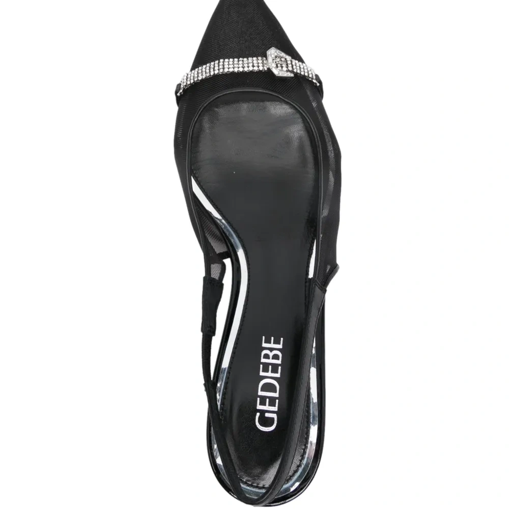 Расцветка Core Black, телячья кожа, сетчатые вставки, декор из кристаллов, заостренный носок, ремешок на пятке, кожаная стелька с логотипом и каблук средней высоты.