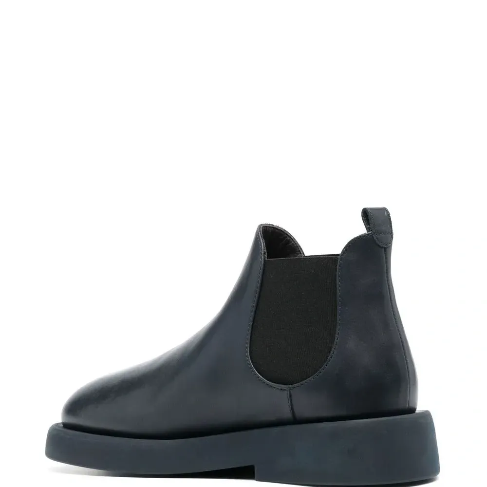 Индиго, телячья кожа, закругленный носок, эластичные боковые вставки и низкий блочный каблук.