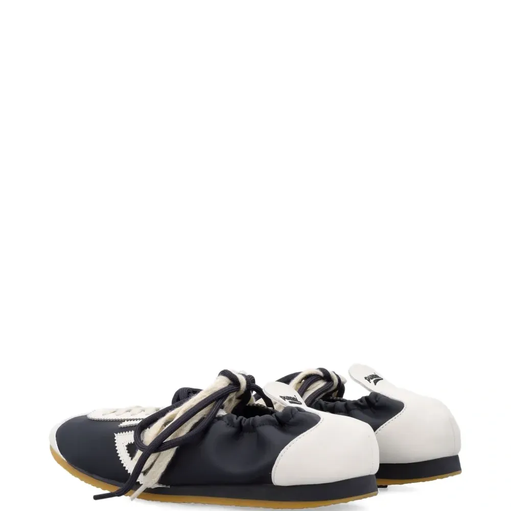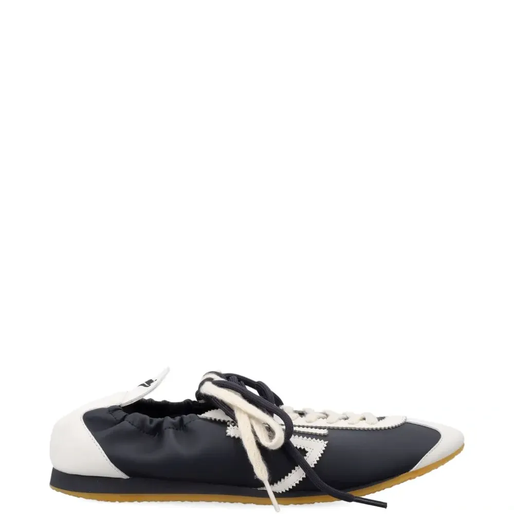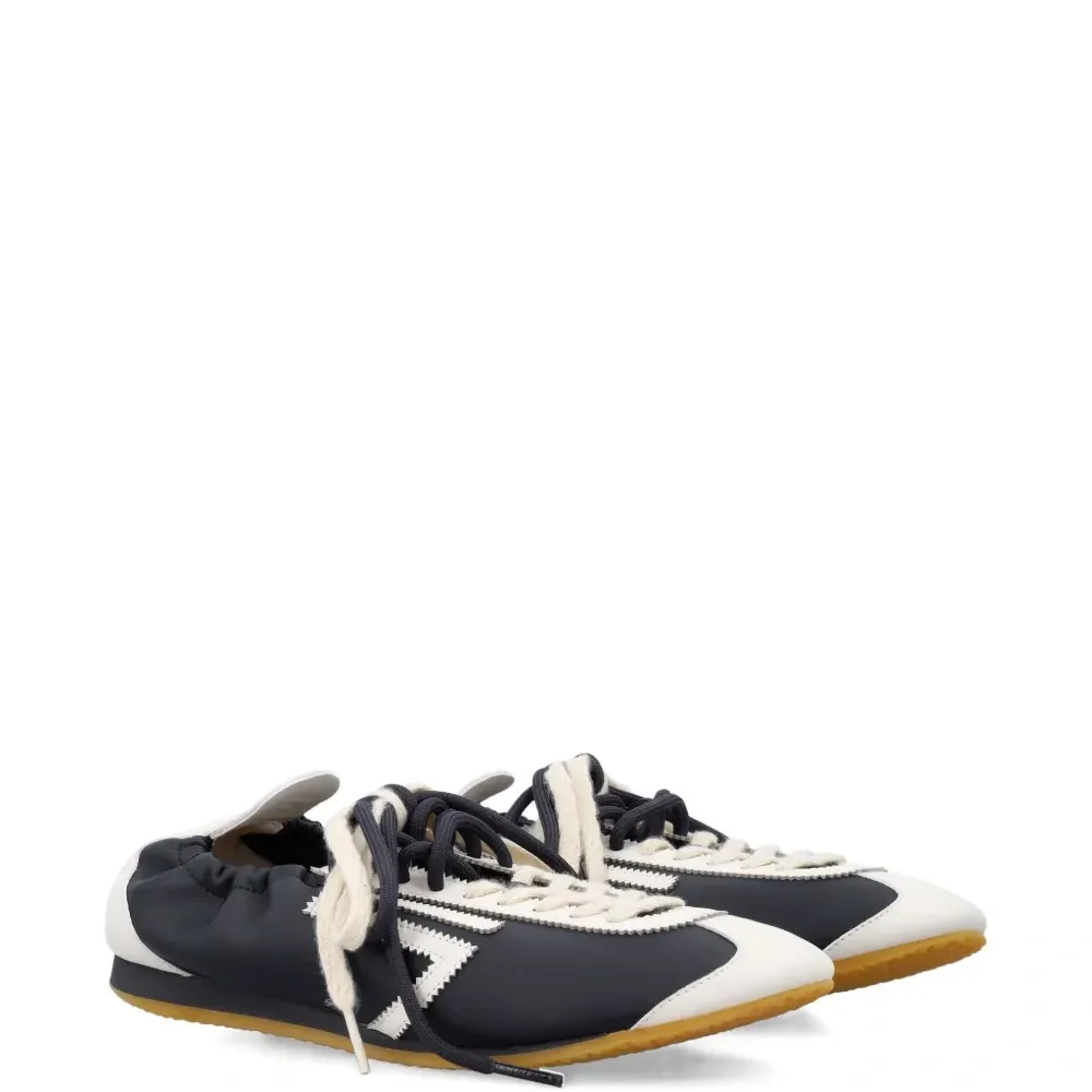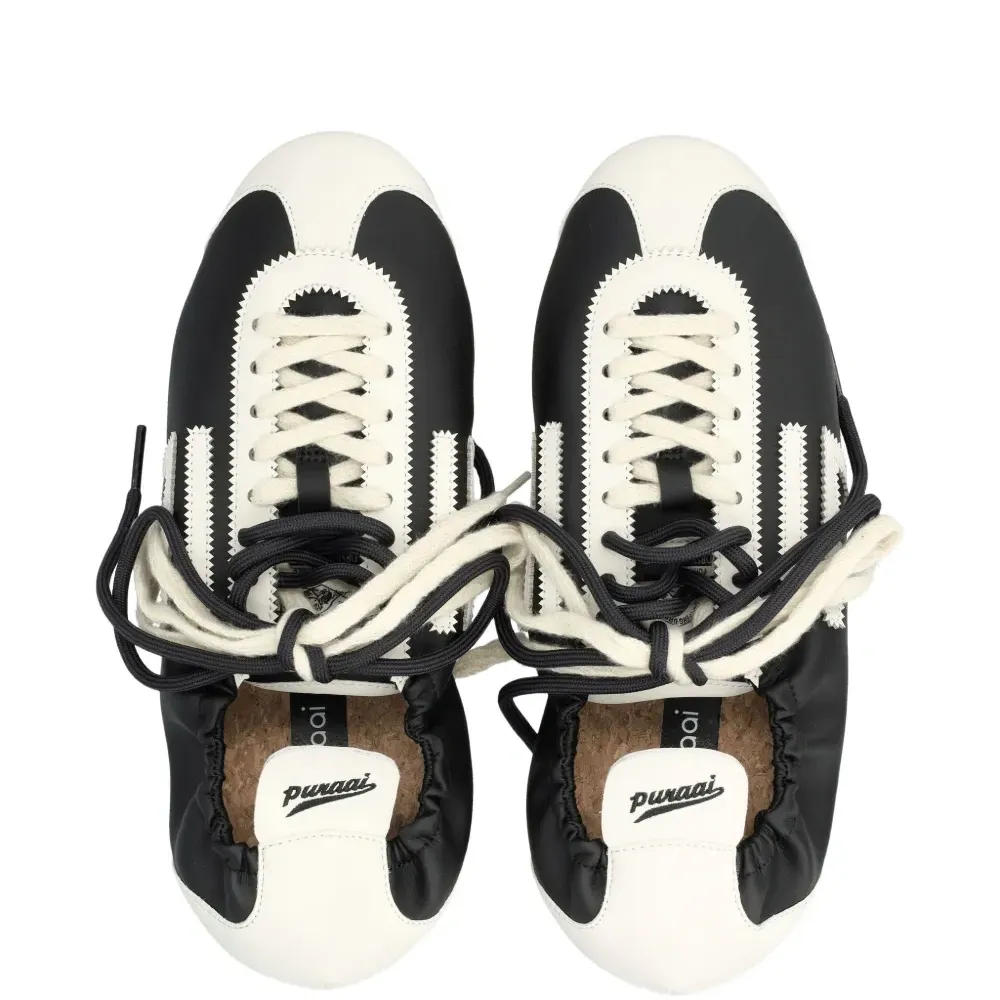 черно-белые кроссовки с шнуровкой, круглым носком, эластичной пяткой и тремя полосками