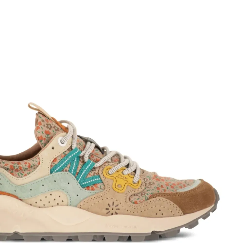 бежевые и разноцветные кроссовки с цветочным принтом, замшевыми вставками, треккинговыми шнурками и люверсами в форме цветка