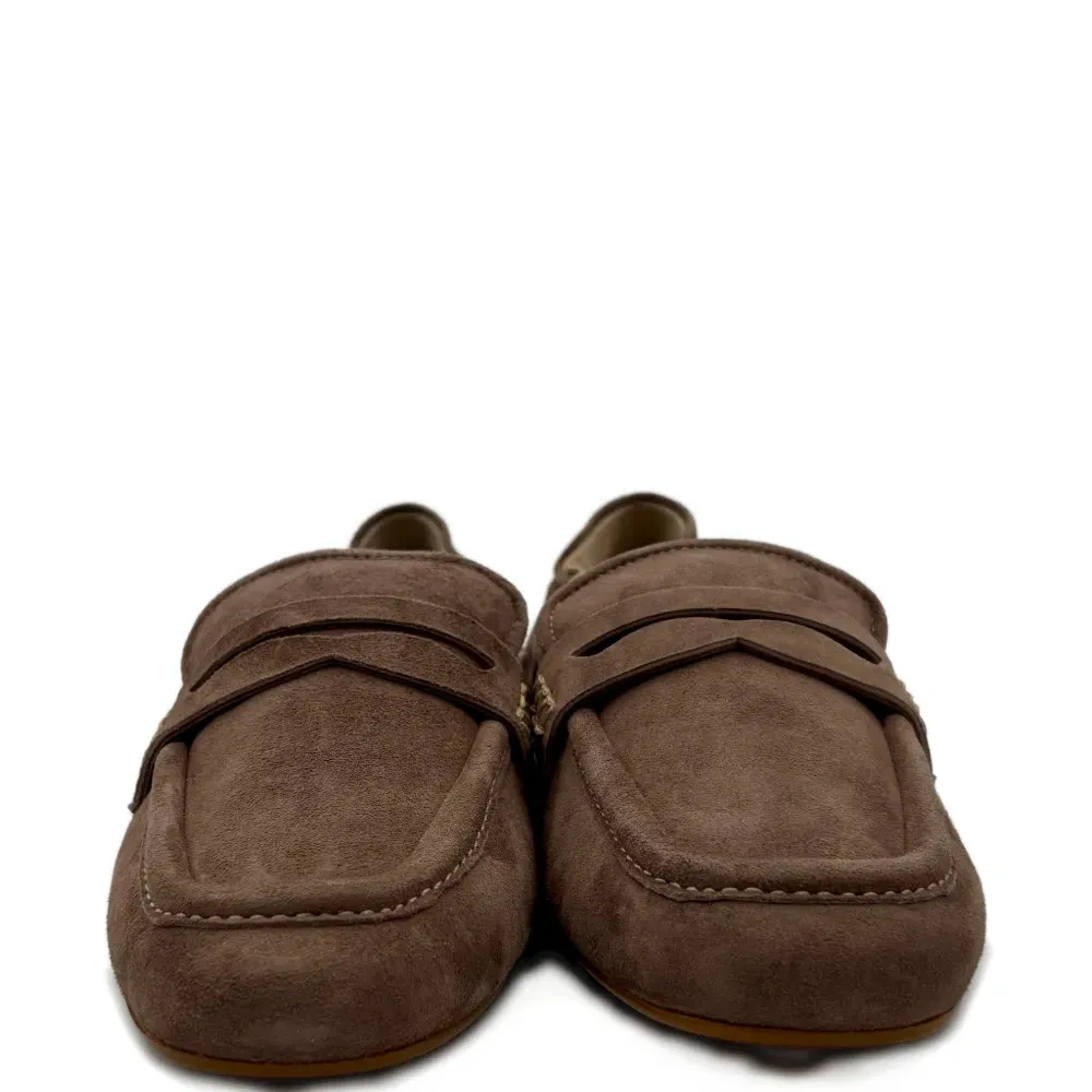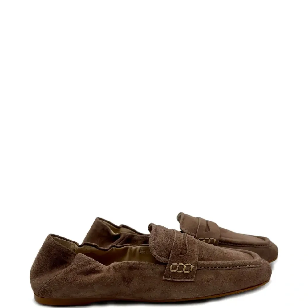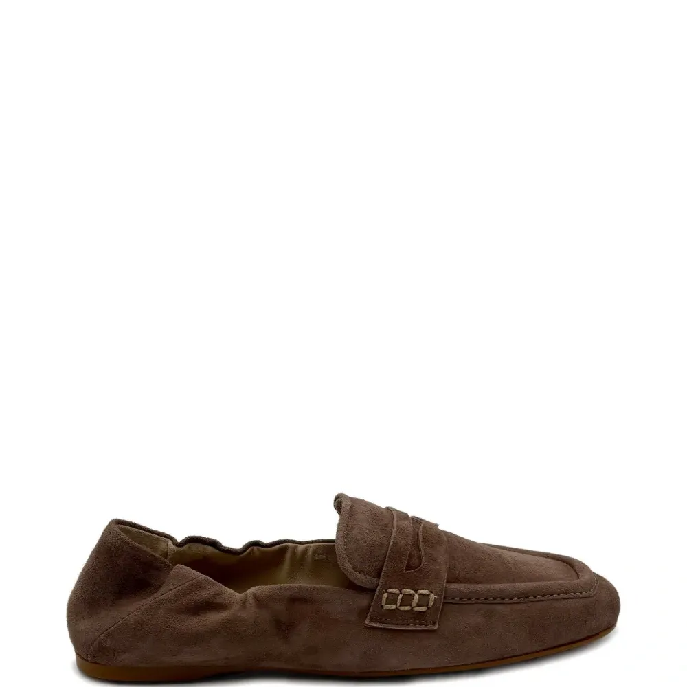 коричневая строчка, ремешок-пенни, сборки, модель без застежки, квадратный носок