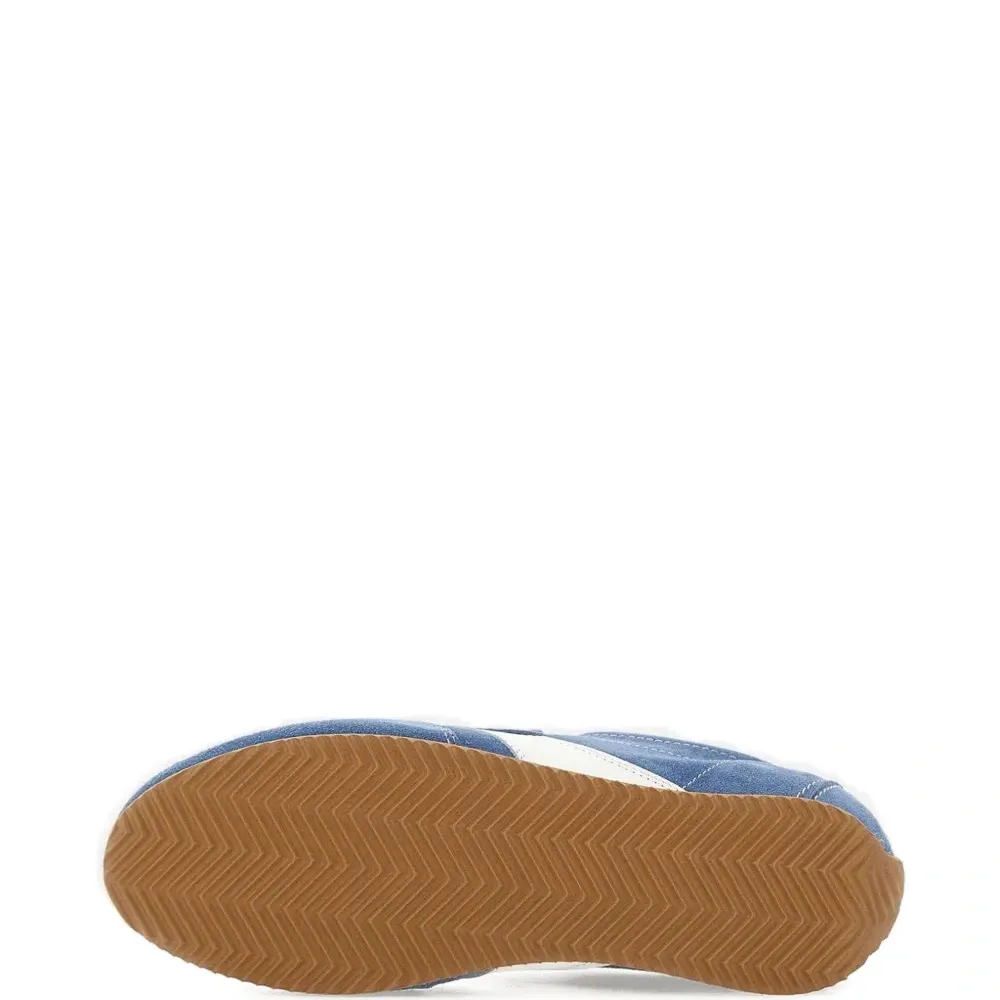 верх из синей замши, логотип на заднике, шнуровка, нашивка с логотипом на язычке, резиновая подошва