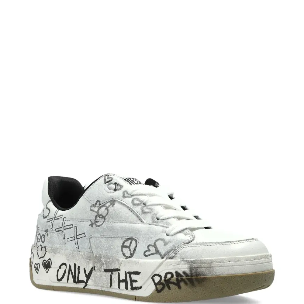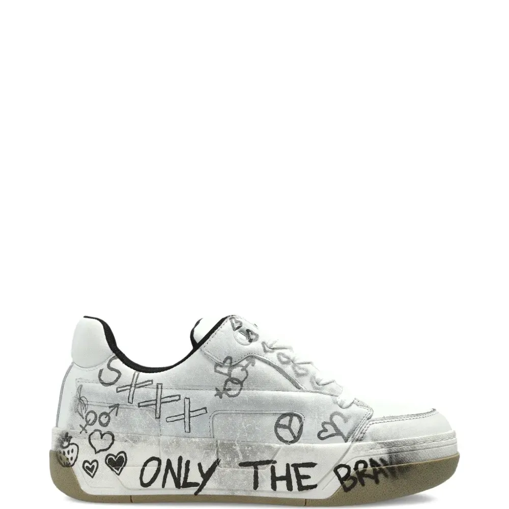 белые кеды с принтом граффити, шнуровкой, округлым носком, плоской подошвой и фирменной стелькой