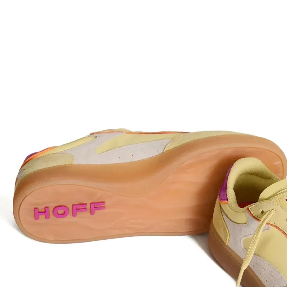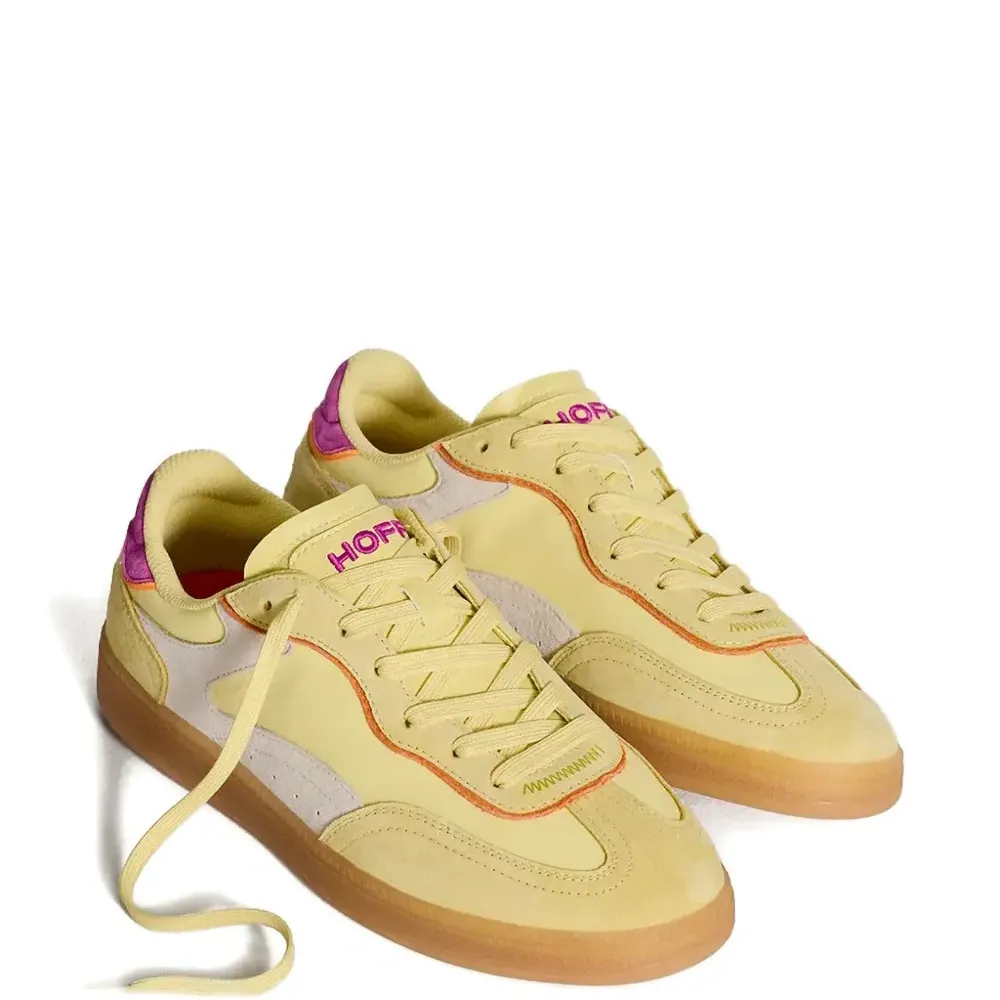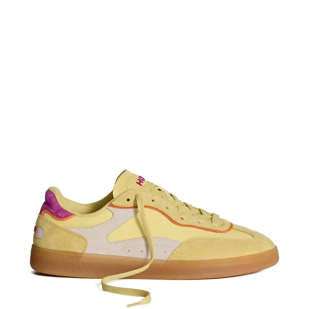 жёлтый цвет-блок, панельный дизайн, шнуровка, круглый нос, плоская резиновая подошва, логотип
