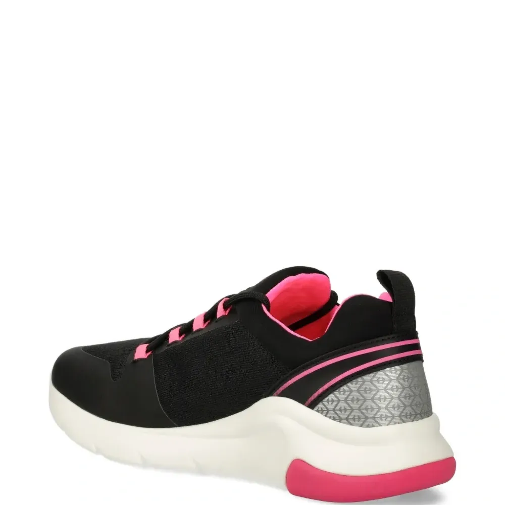 чёрные кроссовки с розовыми акцентами, логотипом, петлёй для удобства надевания, круглым носком и резиновой подошвой