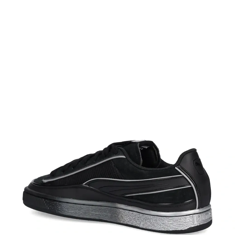 черный, серебристая подошва, шнуровка, круглый носок, принт с логотипом, ребристая резиновая подошва