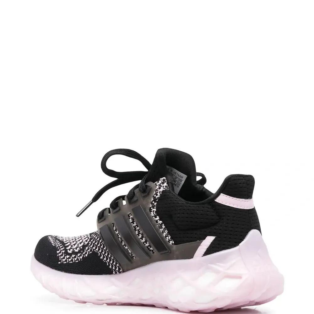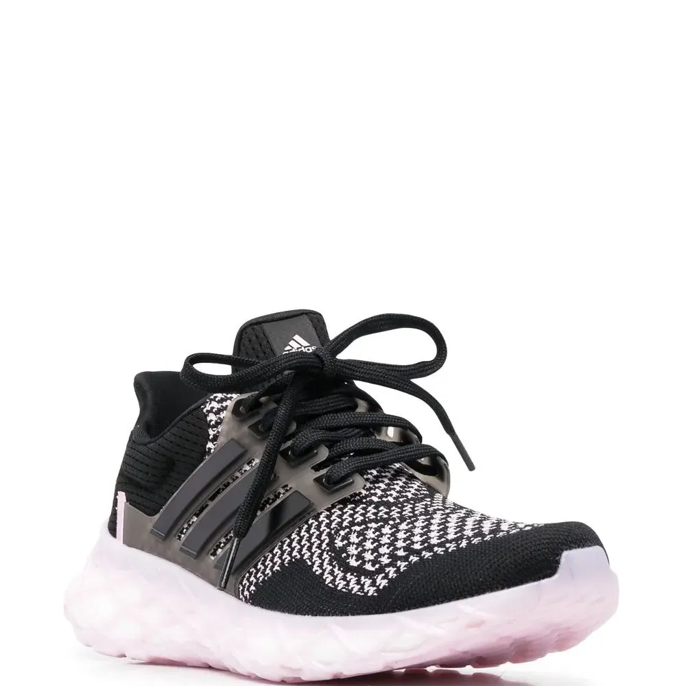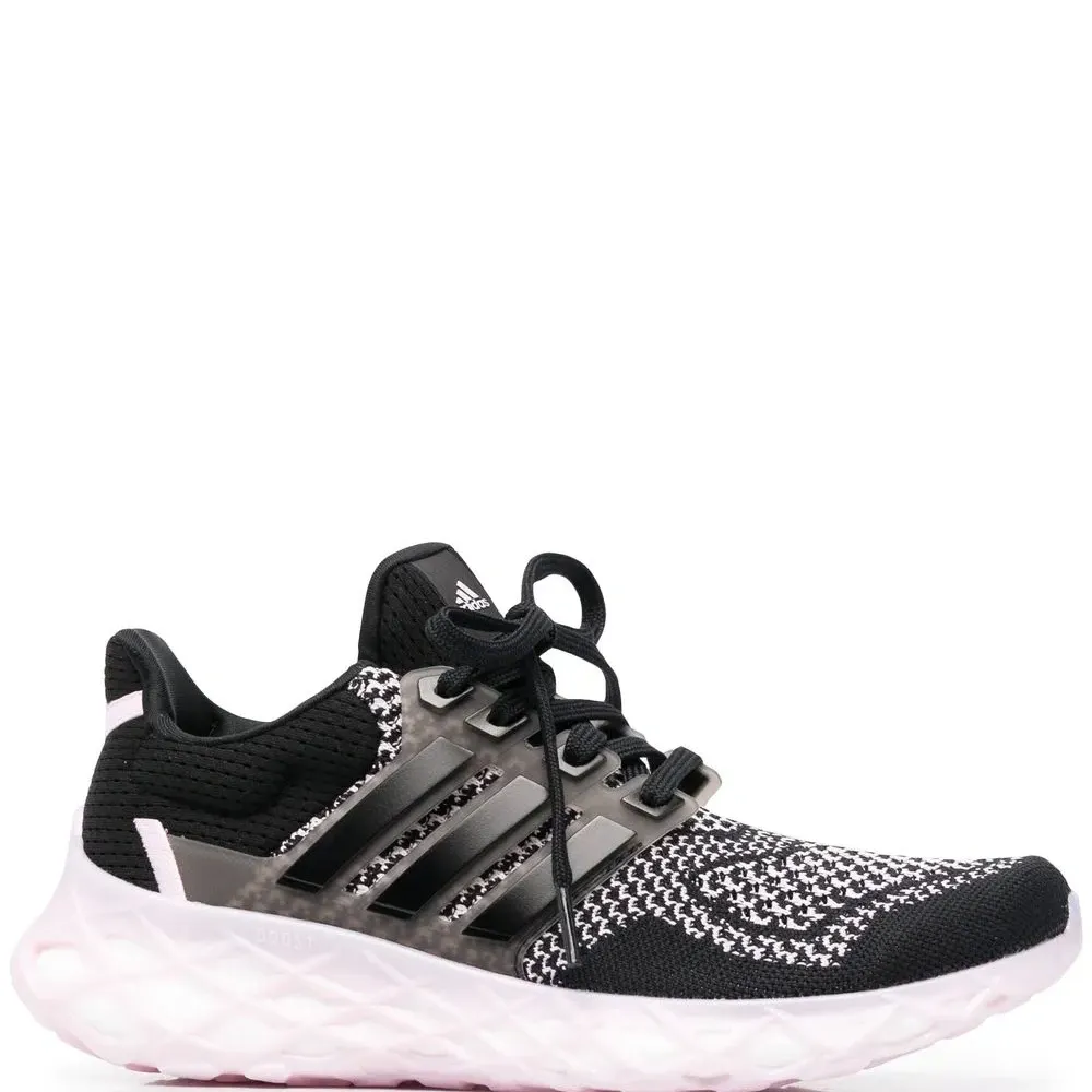 Черный, светло-розовый, знаковый логотип 3-Stripes, язычок с логотипом, закругленный носок, шнуровка спереди, стелька с логотипом и резиновая подошва.