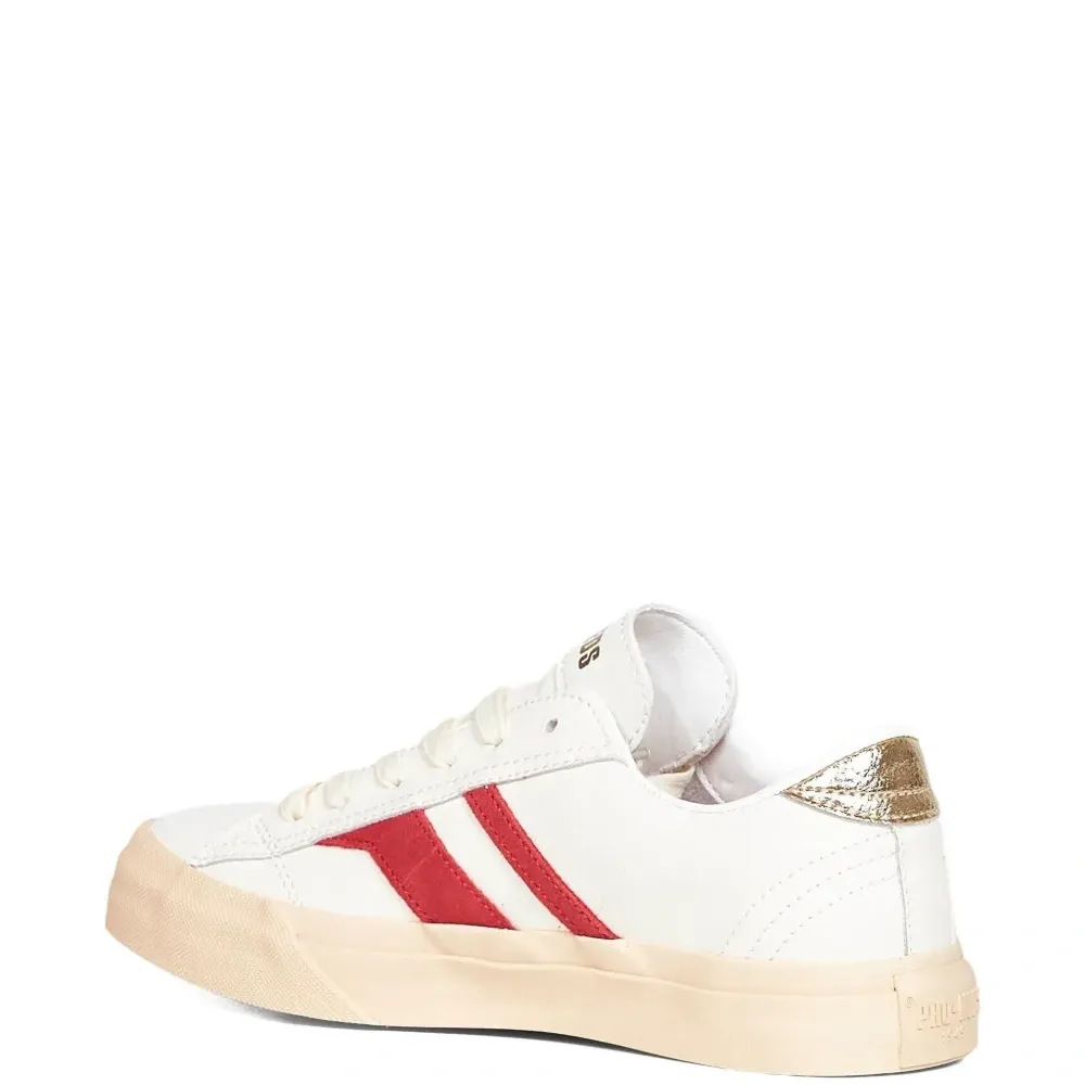 белый цвет, красная полоса спереди, застёжка на шнуровке, логотип, контрастная подошва