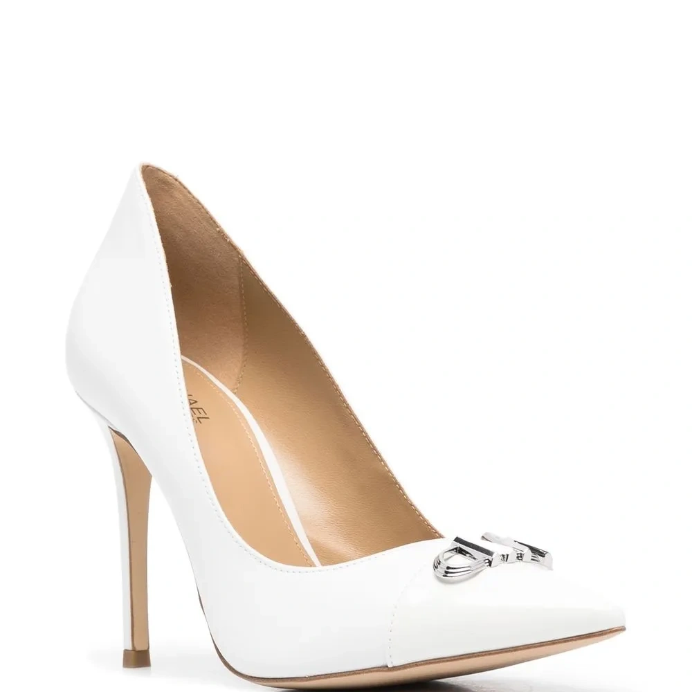 Белый, телячья кожа, серебристый металлический логотип, лакированная отделка, заостренный носок, стелька с логотипом, модель без застежки и каблук на высокой шпильке.