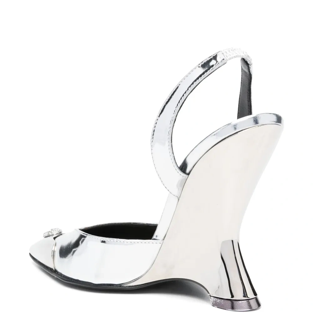 Серебристый, телячья кожа, покрытие с эффектом металлик, модель без застежки, высокая танкетка, ремешок на щиколотке, стелька с логотипом, заостренный носок, подвеска в виде черепа и декор из кристаллов.
