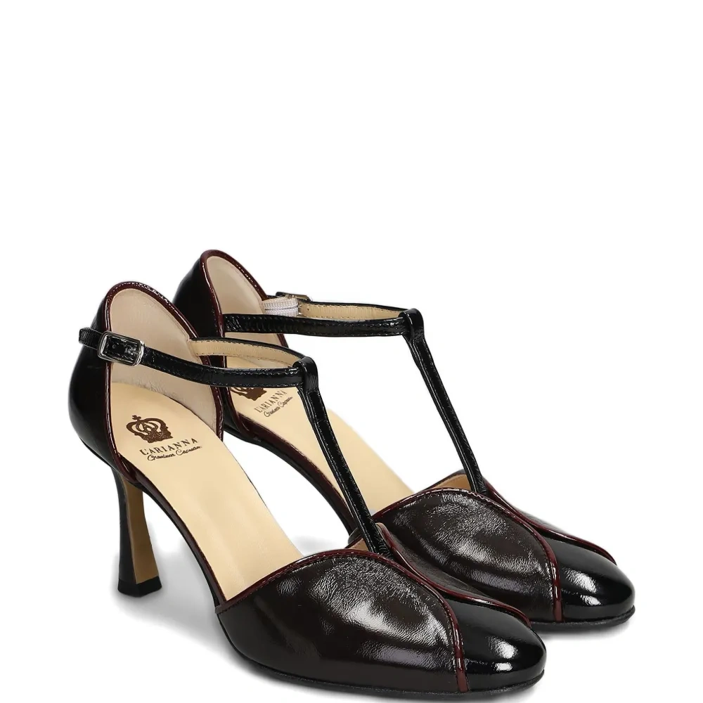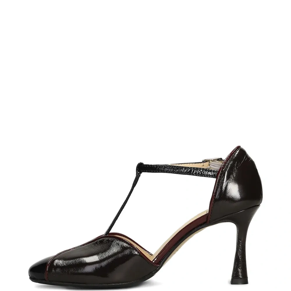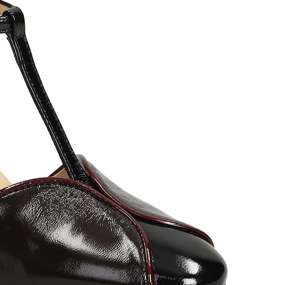 черные туфли с ремешком в стиле "Т-образная перемычка", застежкой-пряжкой, заостренным носком, на шпильке, с лакированным покрытием