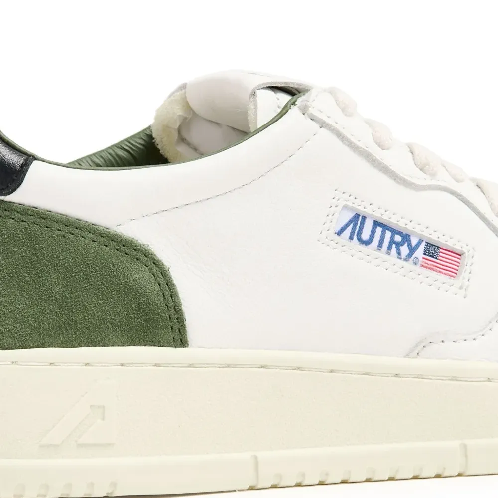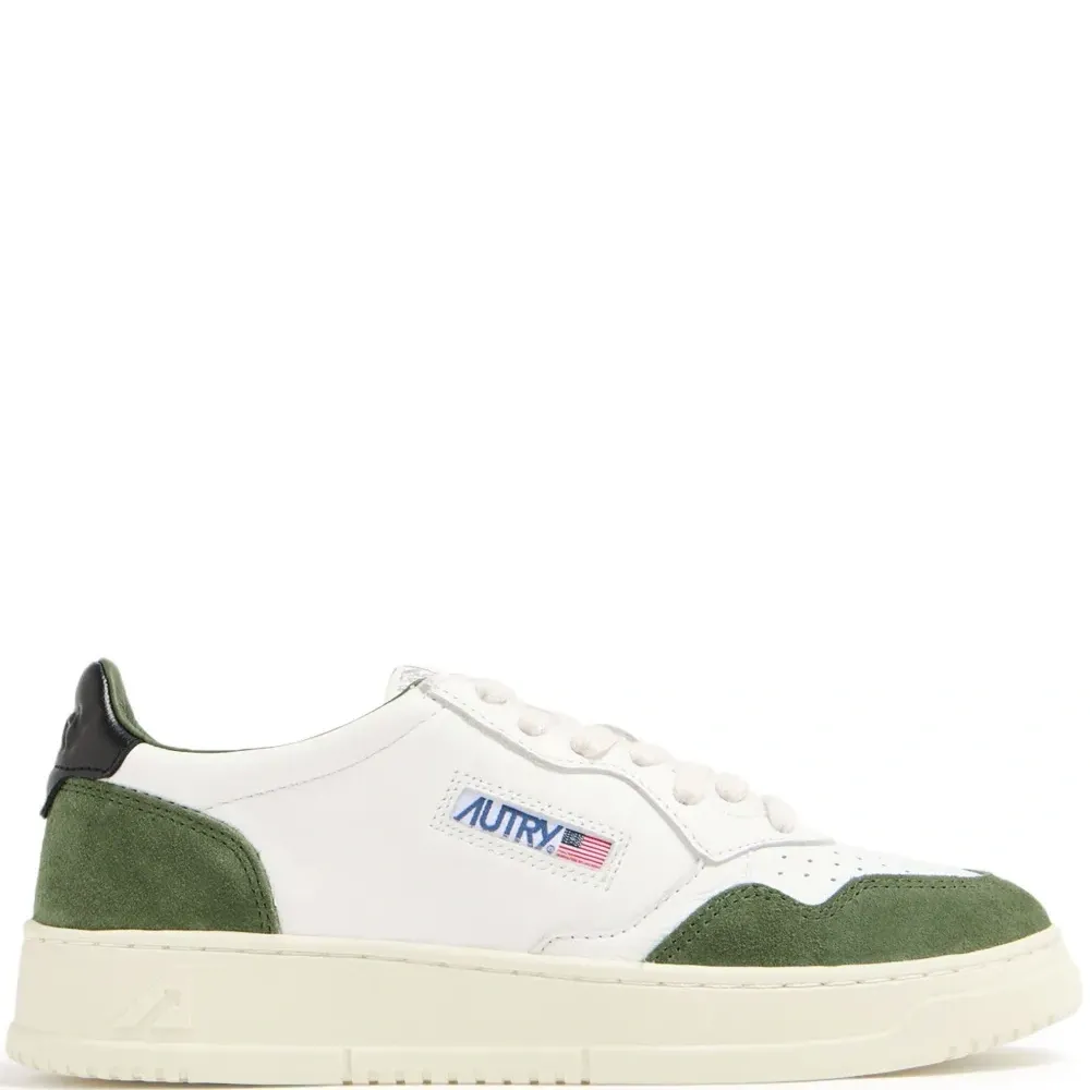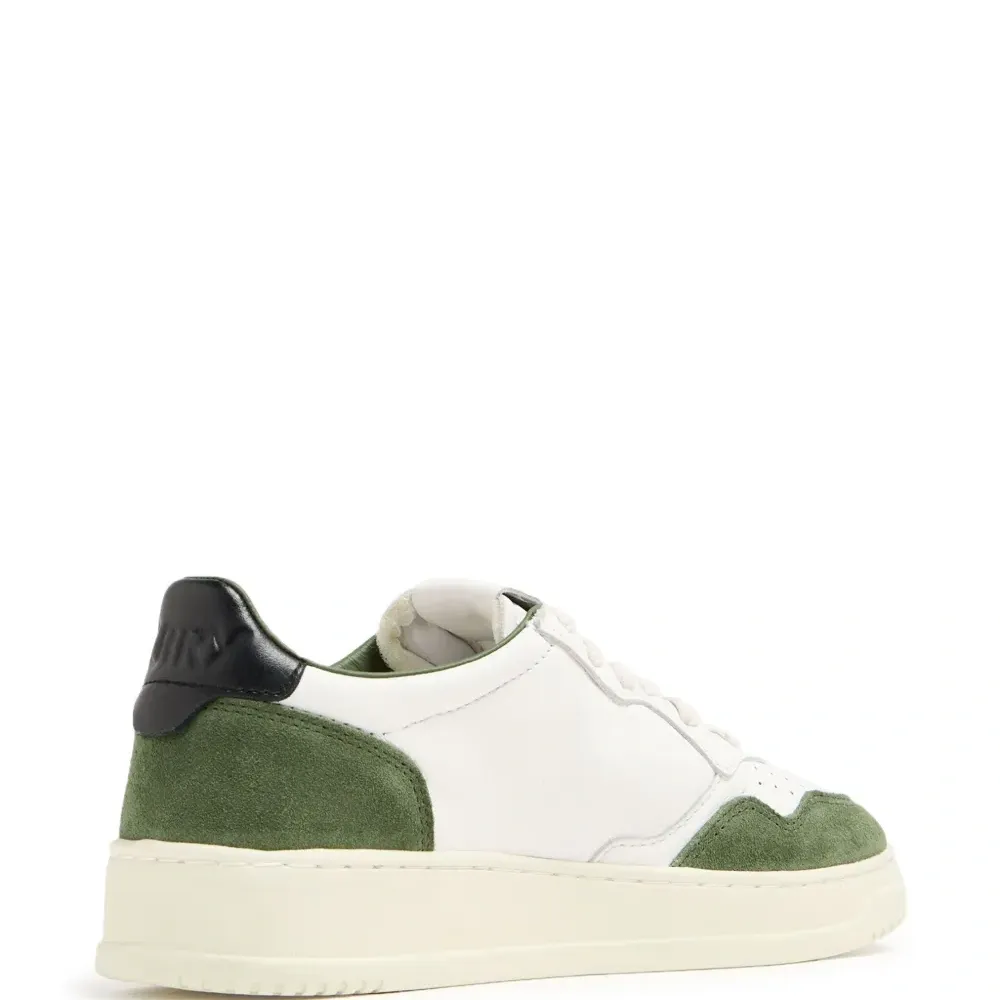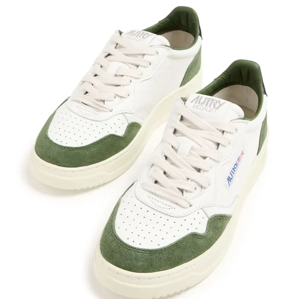 Белый, насыщенный зеленый, телячья кожа, замша, нашивка с логотипом сбоку, закругленный носок, перфорация, шнуровка спереди, нашивка с логотипом на язычке, стелька с логотипом и плоская резиновая подошва.