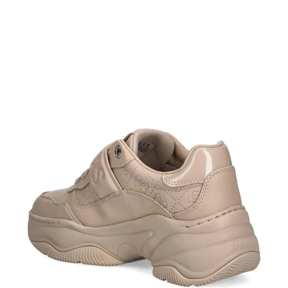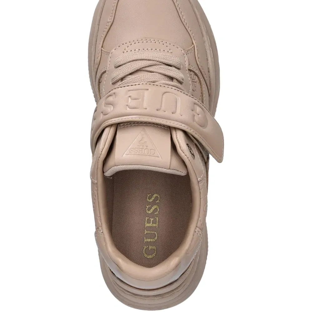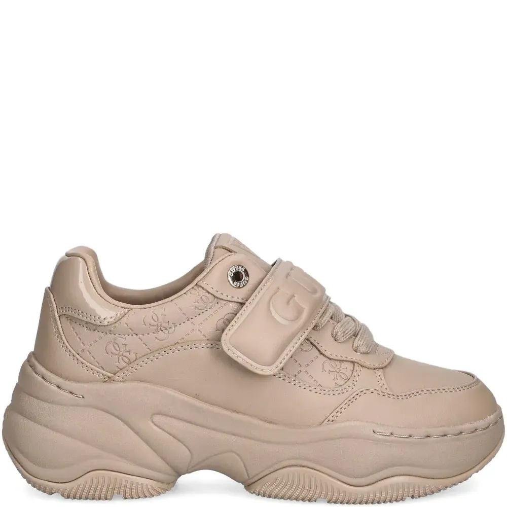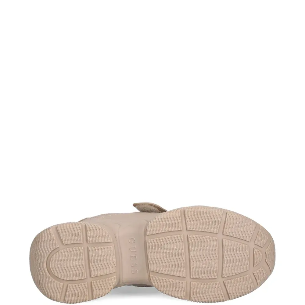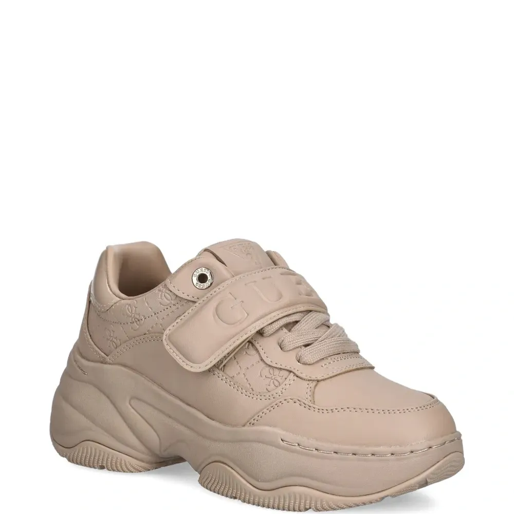 бежевый цвет, тиснёный узор, застёжка-липучка спереди, шнуровка спереди, логотип-надпись, массивная подошва