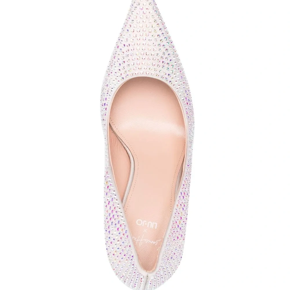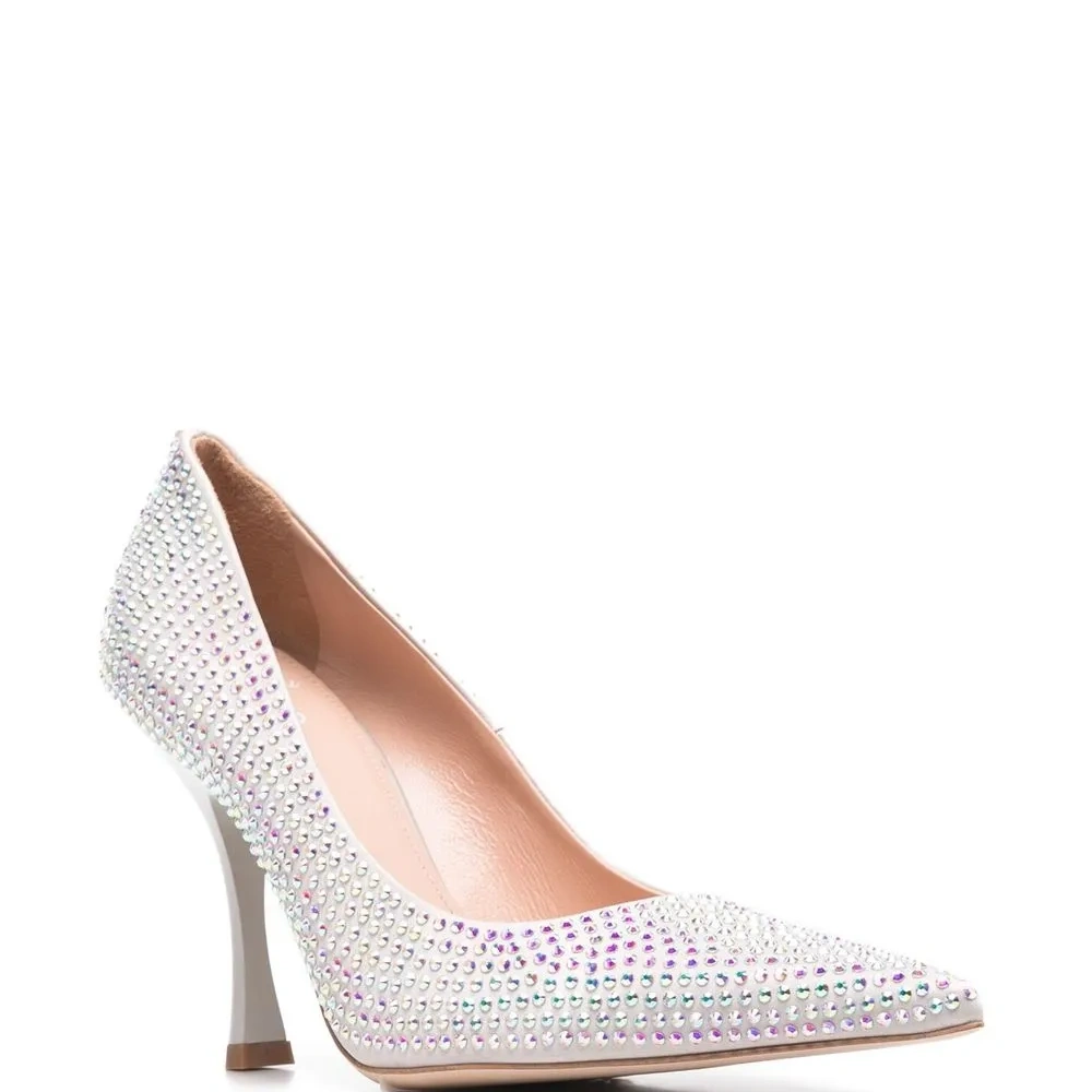 Разноцветный, кожа, модель без застежки, декор из кристаллов, заостренный носок, кожаная стелька с логотипом и высокий скульптурный каблук.