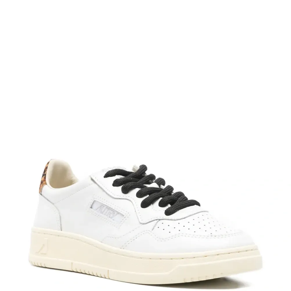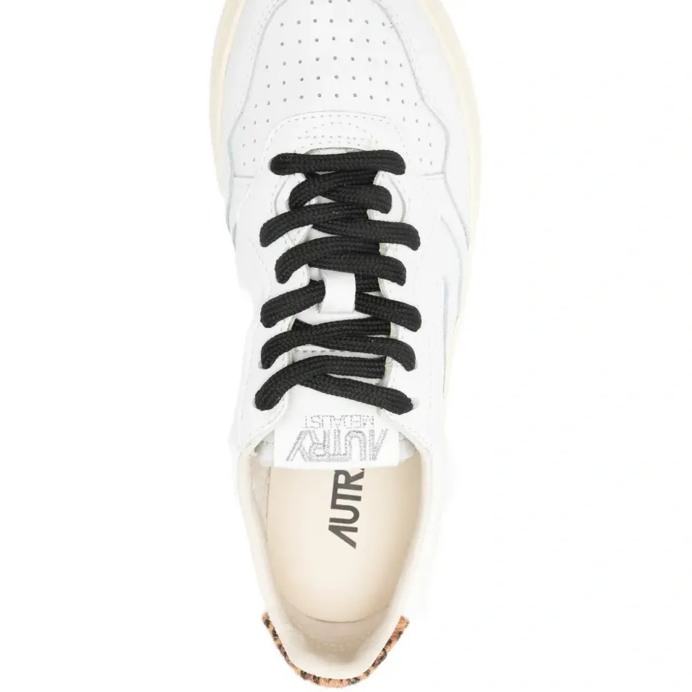 белый цвет, леопардовый принт, шнуровка спереди, плоская подошва, перфорированный мысок, нашивка с логотипом. В комплект входит защитный мешочек для хранения.