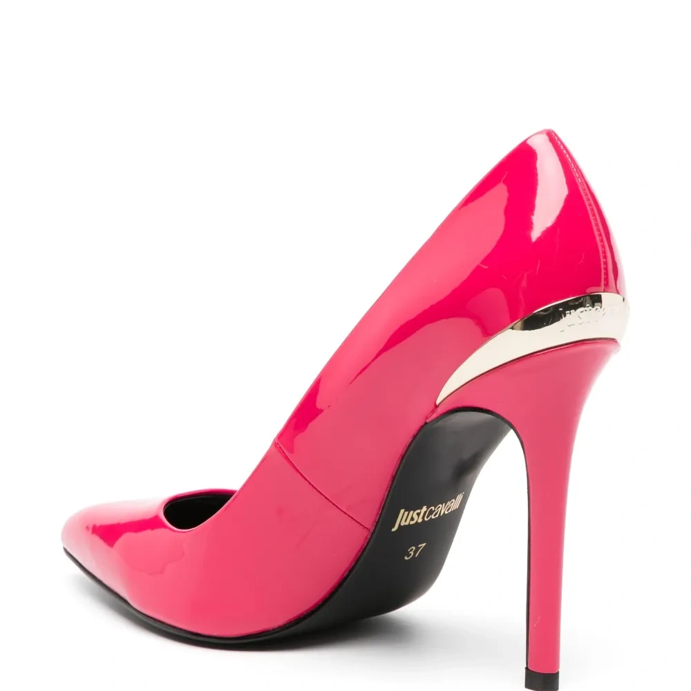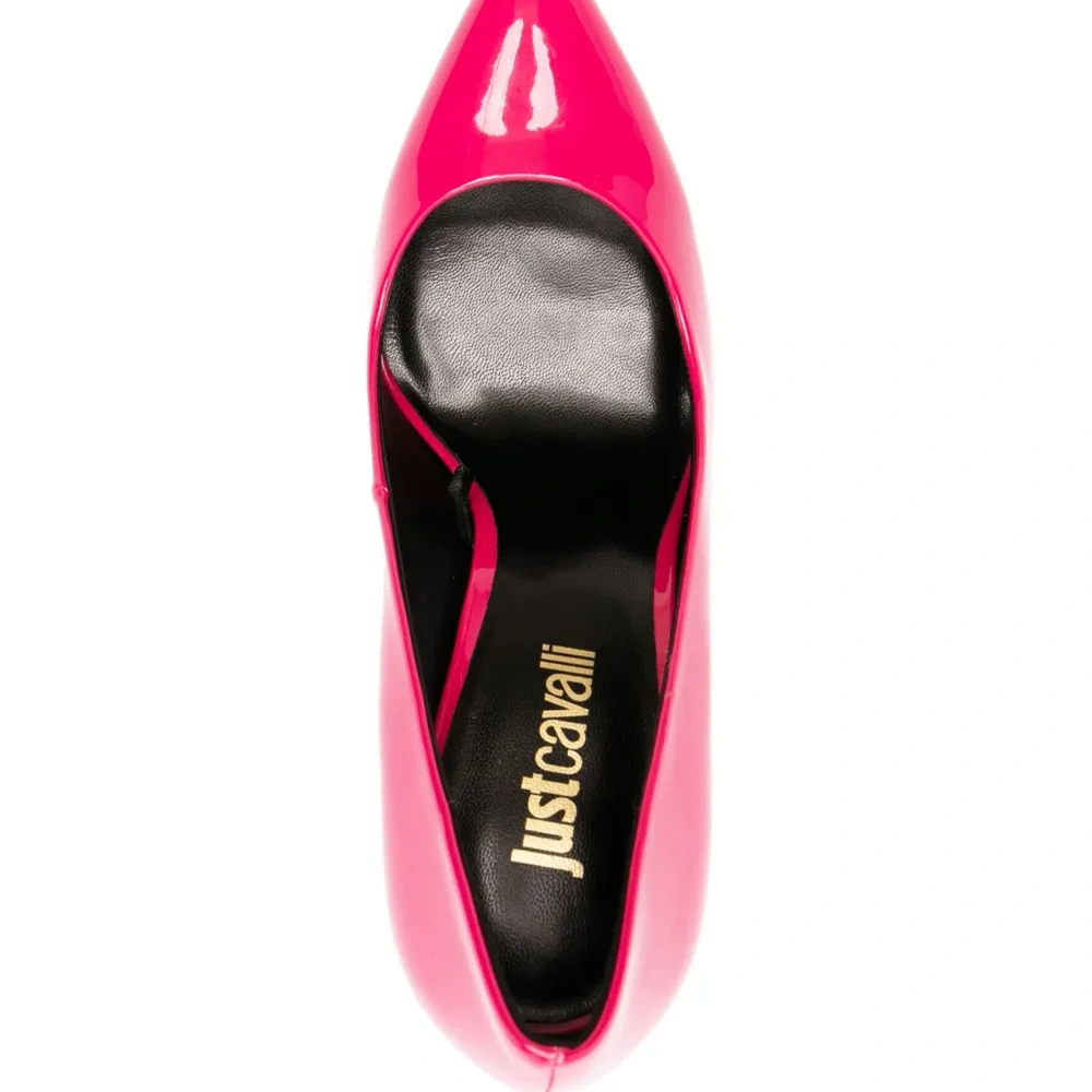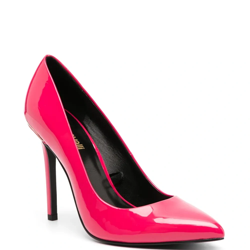 Ярко-розовый, лакированная отделка, заостренный носок, логотип на стельке и каблук на высокой шпильке.