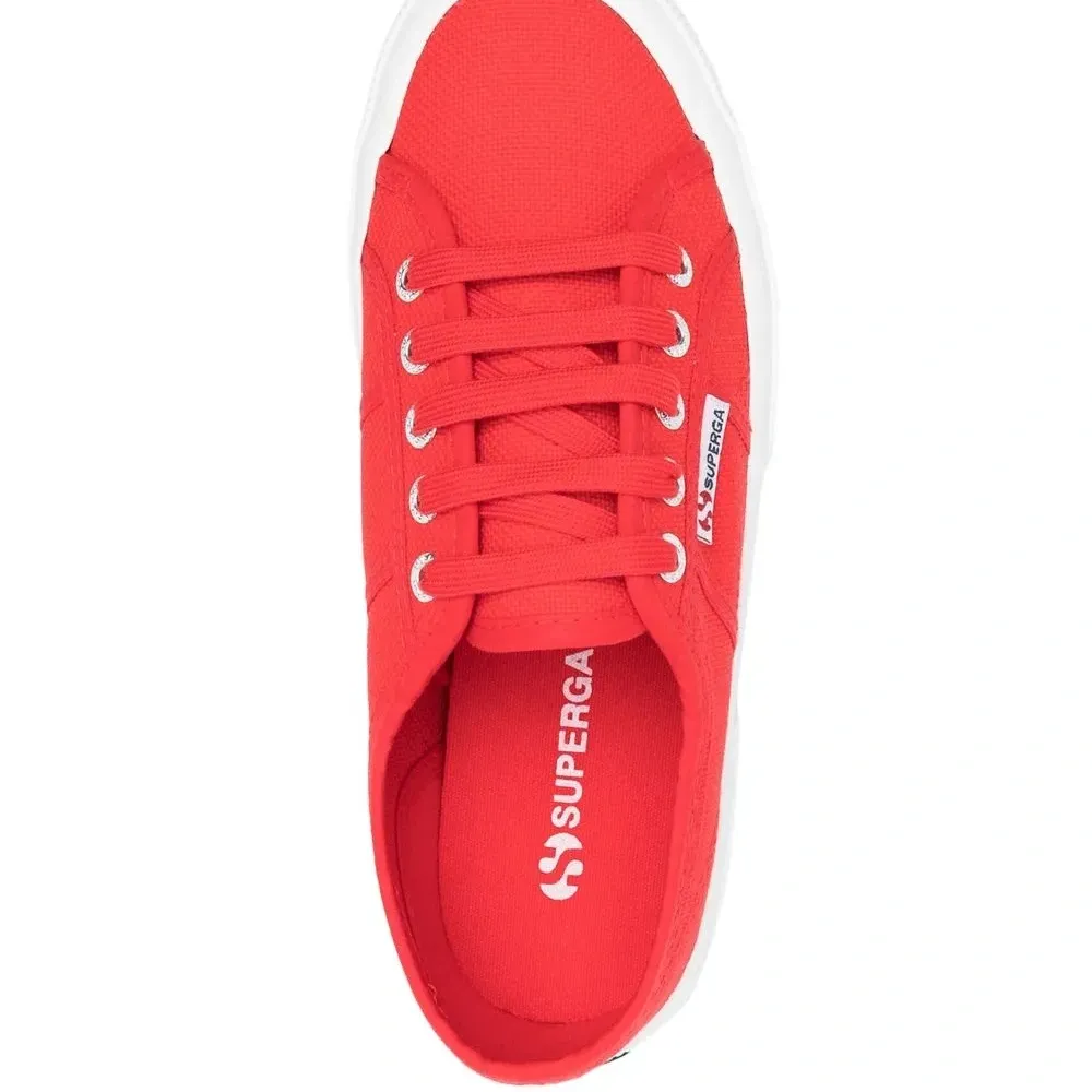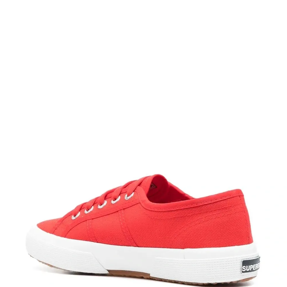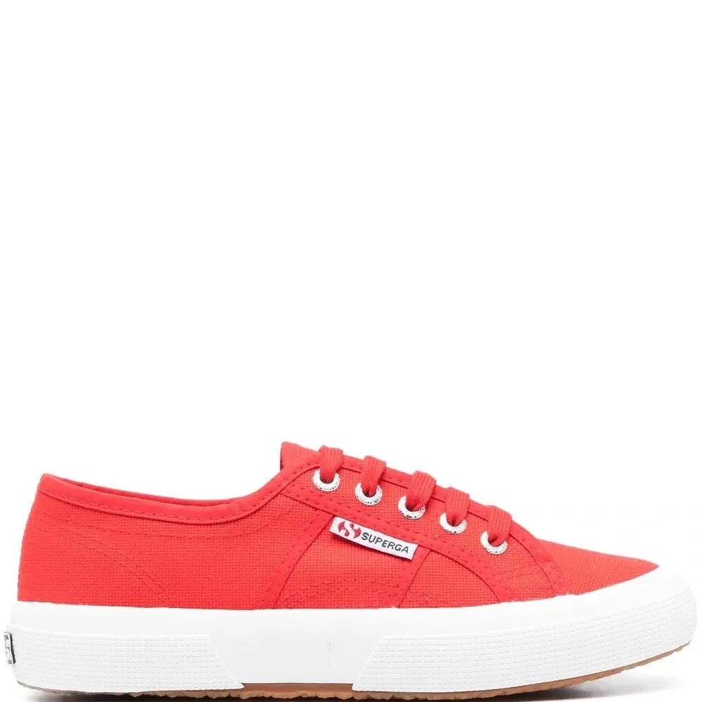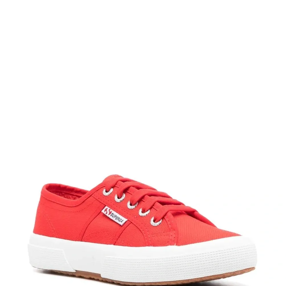 Ярко-красный, парусина, бирка с логотипом, закругленный носок, шнуровка спереди, стелька с логотипом и плоская резиновая подошва.