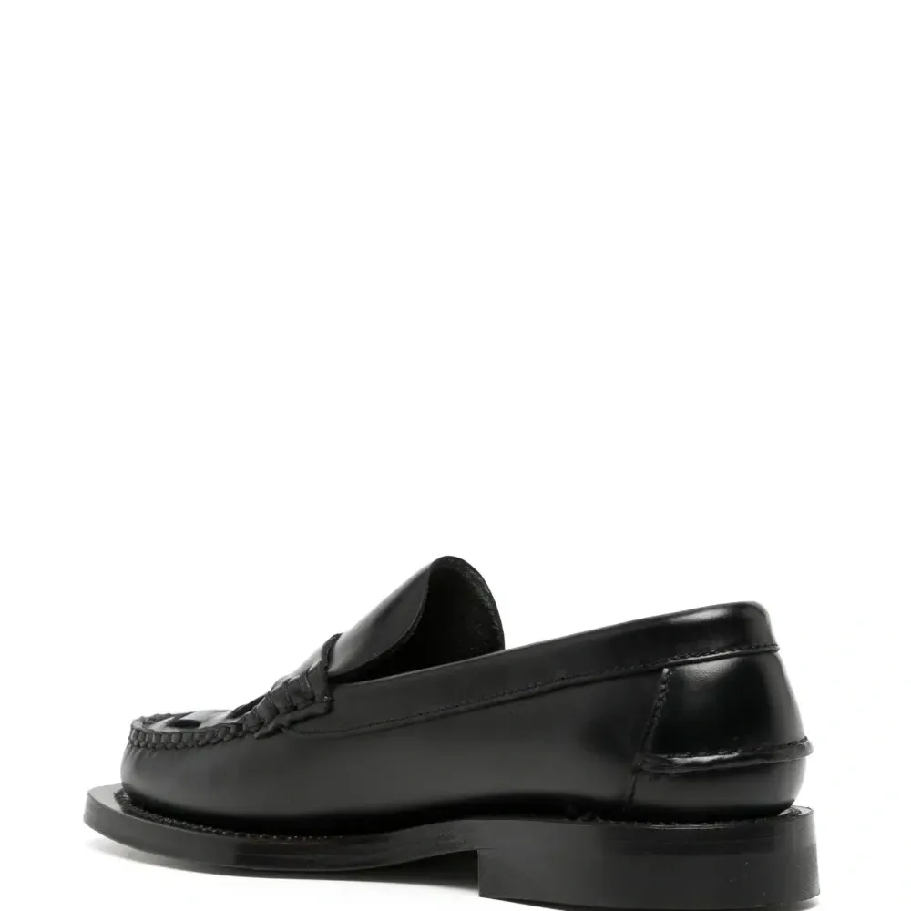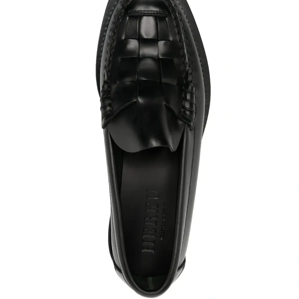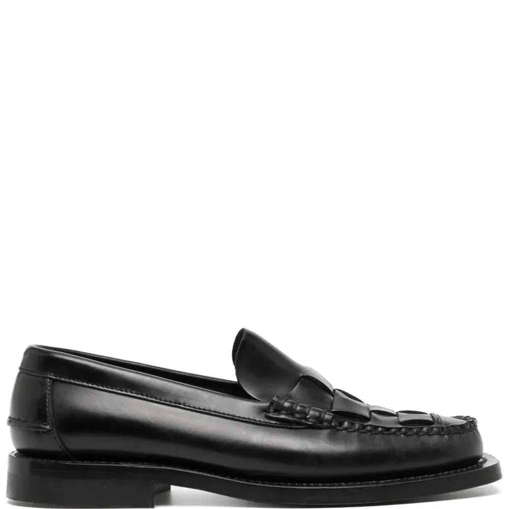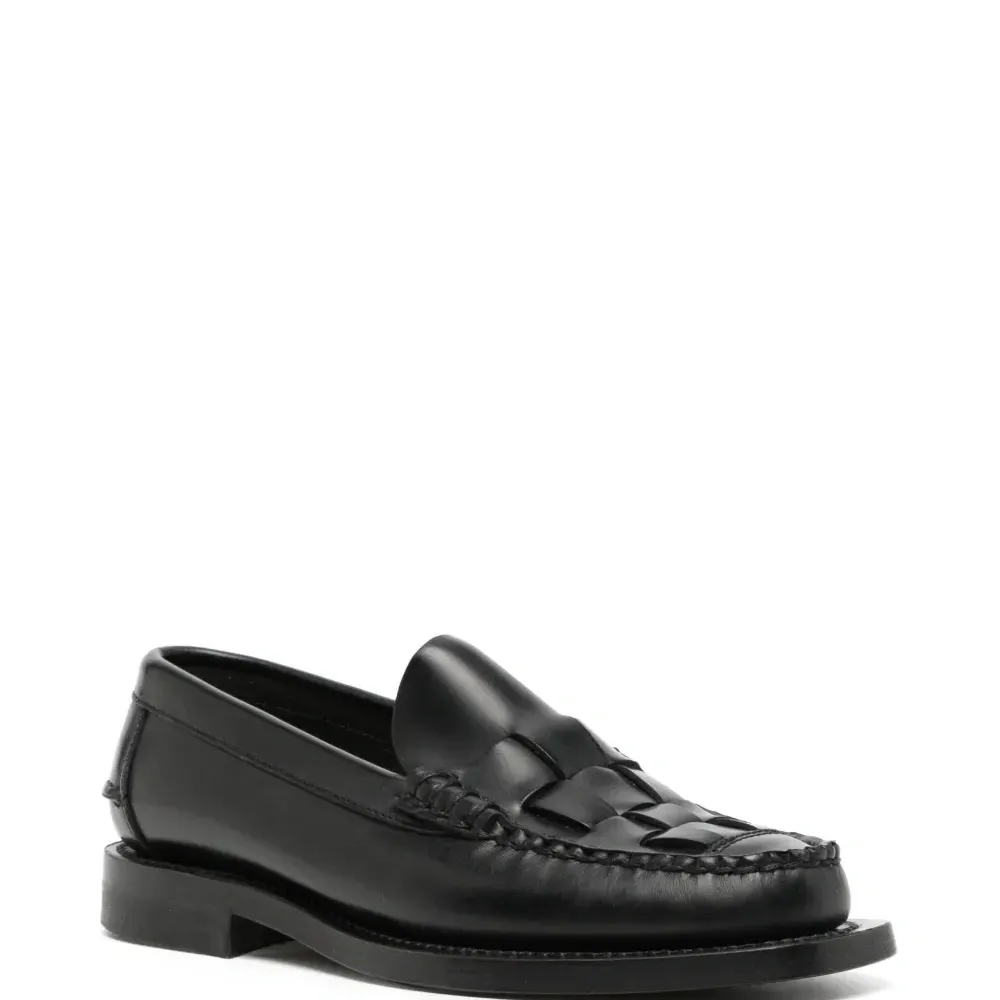 Черный, кожа, переплетенный дизайн, модель без застежки, квадратный носок, стелька с логотипом и плоская подошва.