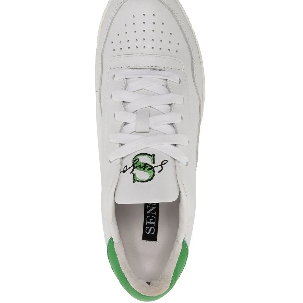 Кремовый, салатовый, телячья кожа, перфорация, язычок с вышитым логотипом, закругленный носок, шнуровка спереди, стелька с логотипом, контрастный задник и плоская резиновая подошва.