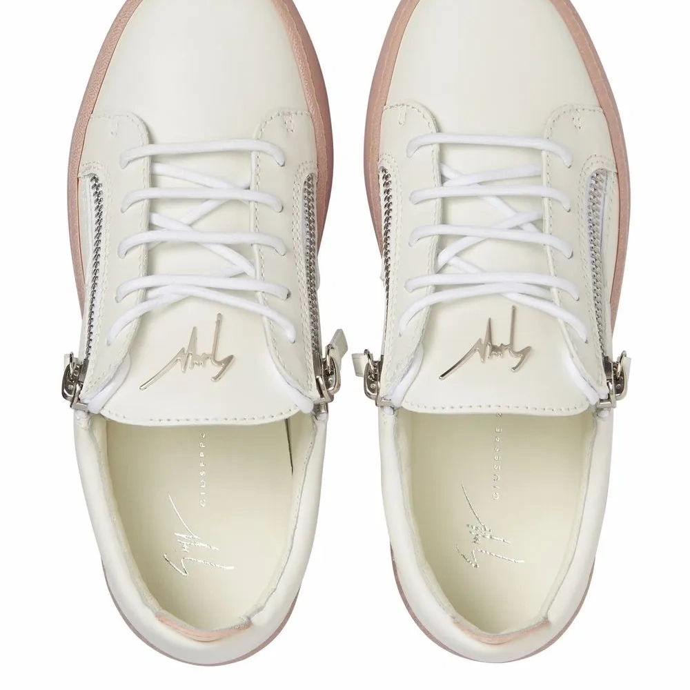Металлический логотип на язычке, закругленный носок, шнуровка спереди, застежка на молнии сбоку, стелька с логотипом и плоская резиновая подошва. Цвет: белый.