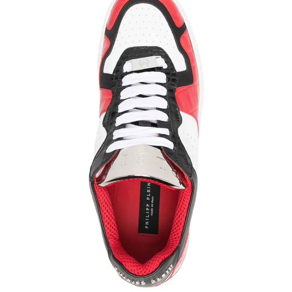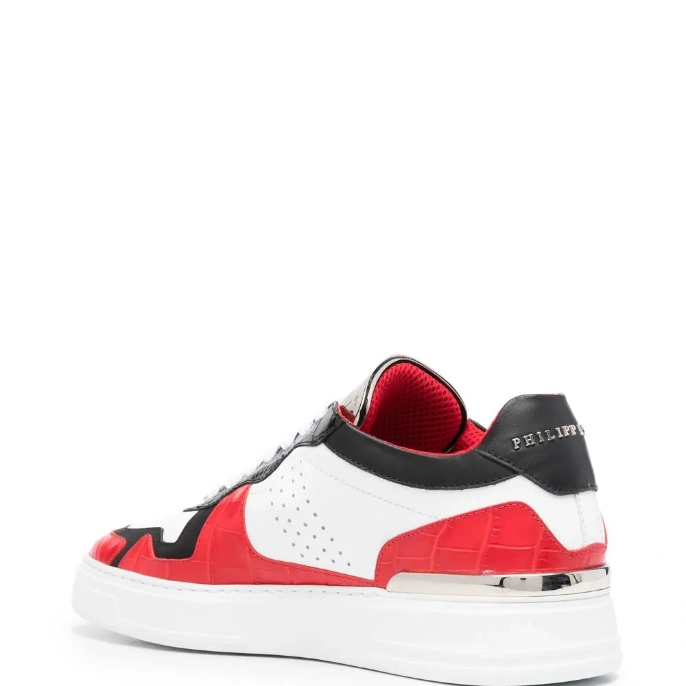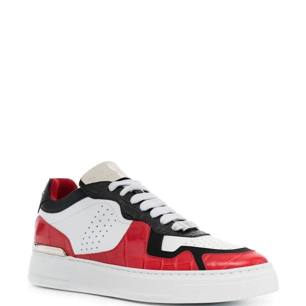 Красный, кожа, стиль колор-блок, тиснение под кожу крокодила, перфорация, тисненый логотип на язычке, серебристый логотип, шнуровка спереди, закругленный носок и плоская резиновая подошва.