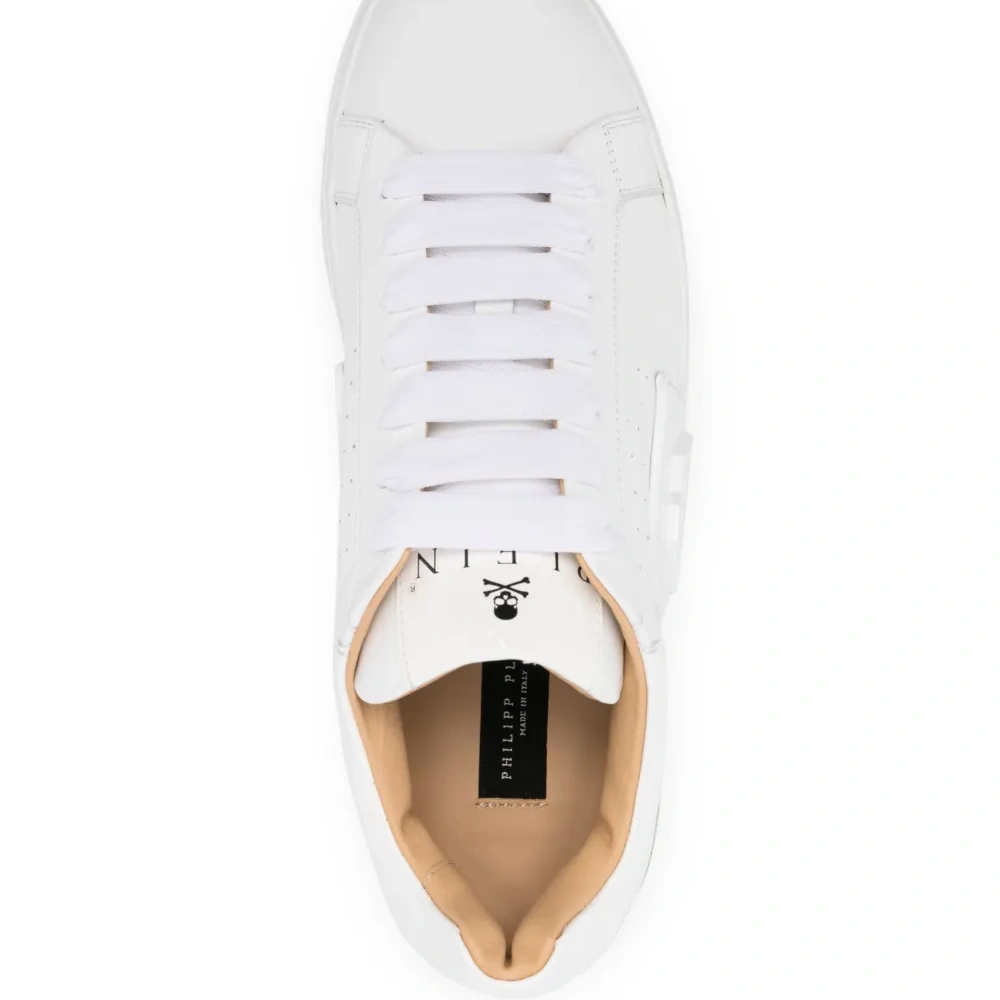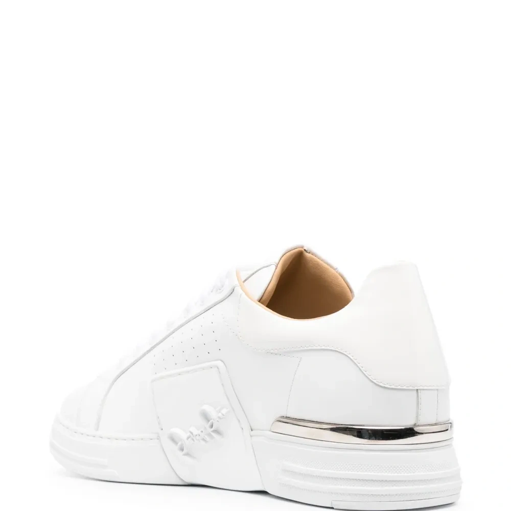 Белый, телячья кожа, тисненый логотип сбоку, язычок с логотипом, закругленный носок, шнуровка спереди, перфорация, стелька с логотипом и плоская подошва.