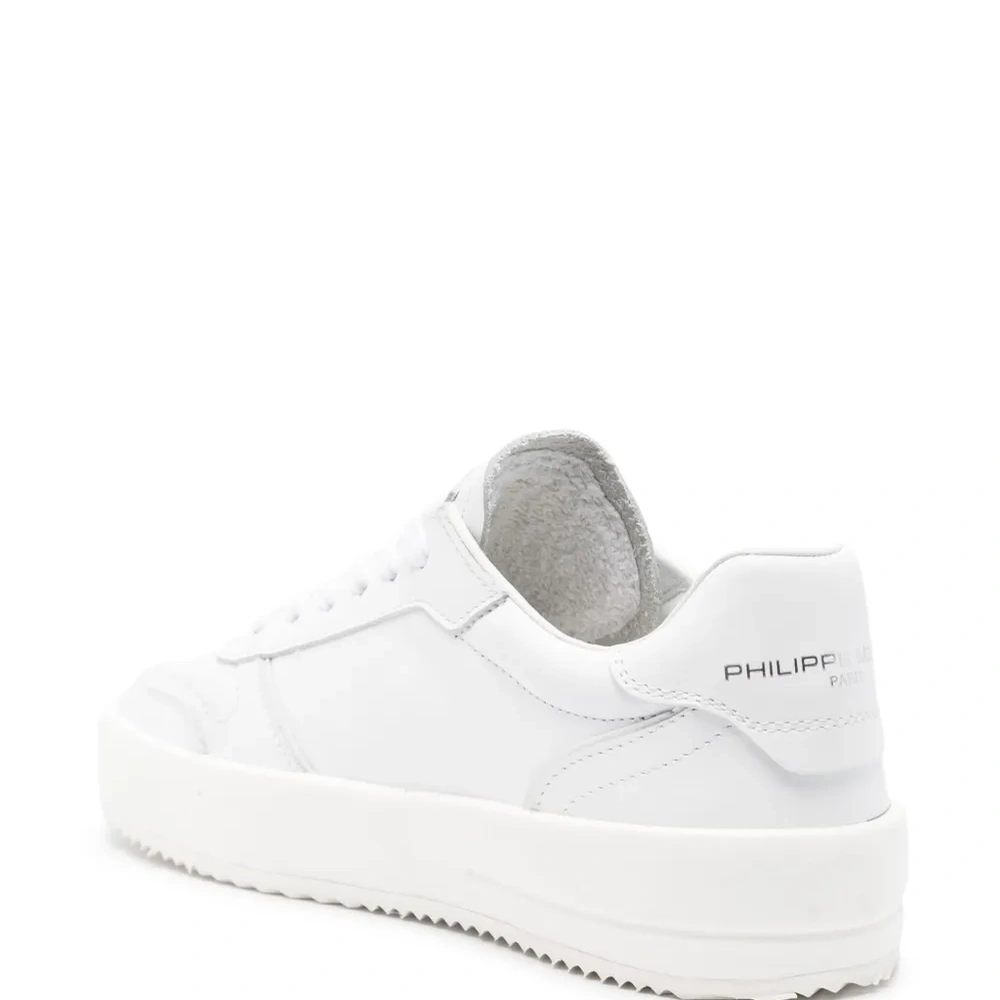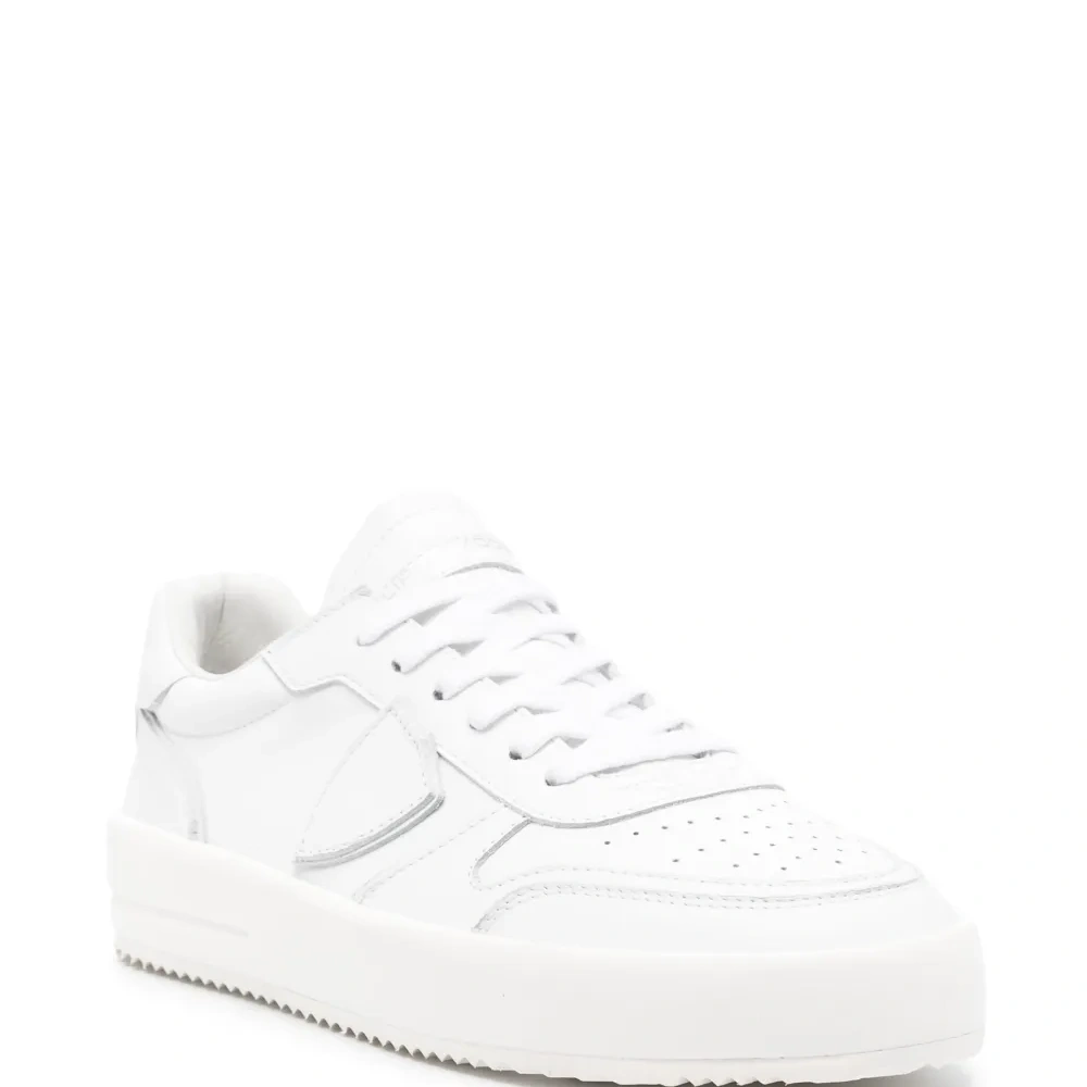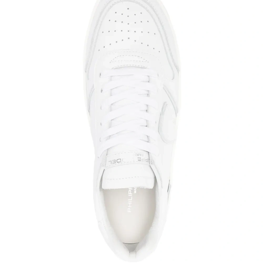 Белый, телячья кожа, строчка в тон, нашивка с логотипом сбоку, нашивка с логотипом на язычке, контрастный задник, перфорированный носок, закругленный носок, шнуровка спереди, стелька с логотипом и плоская резиновая подошва.