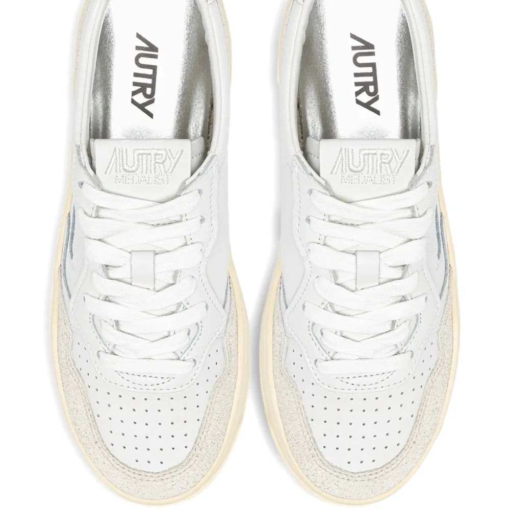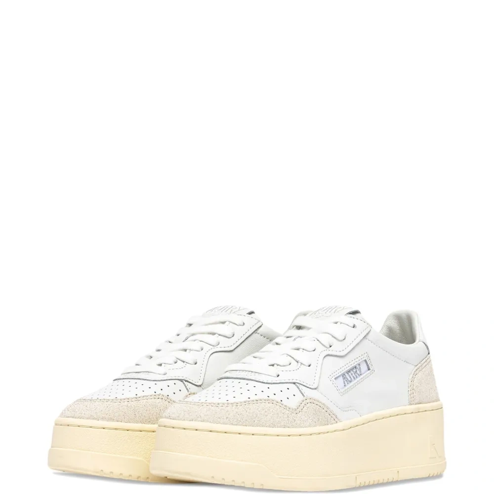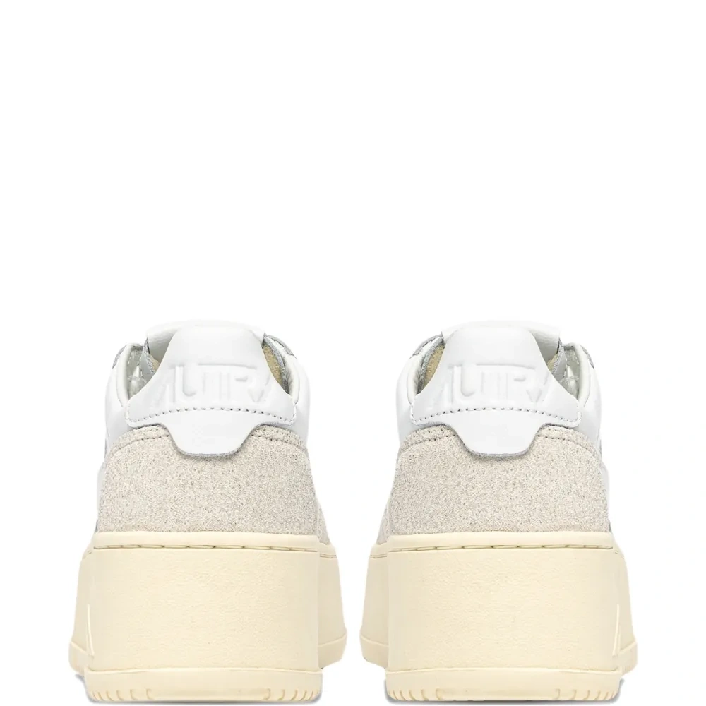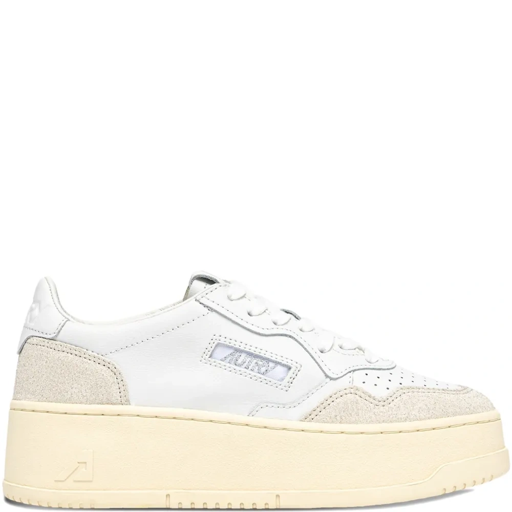 белый цвет, панельный дизайн, подошва-платформа, перфорированные элементы, наличие логотипа, шнуровка