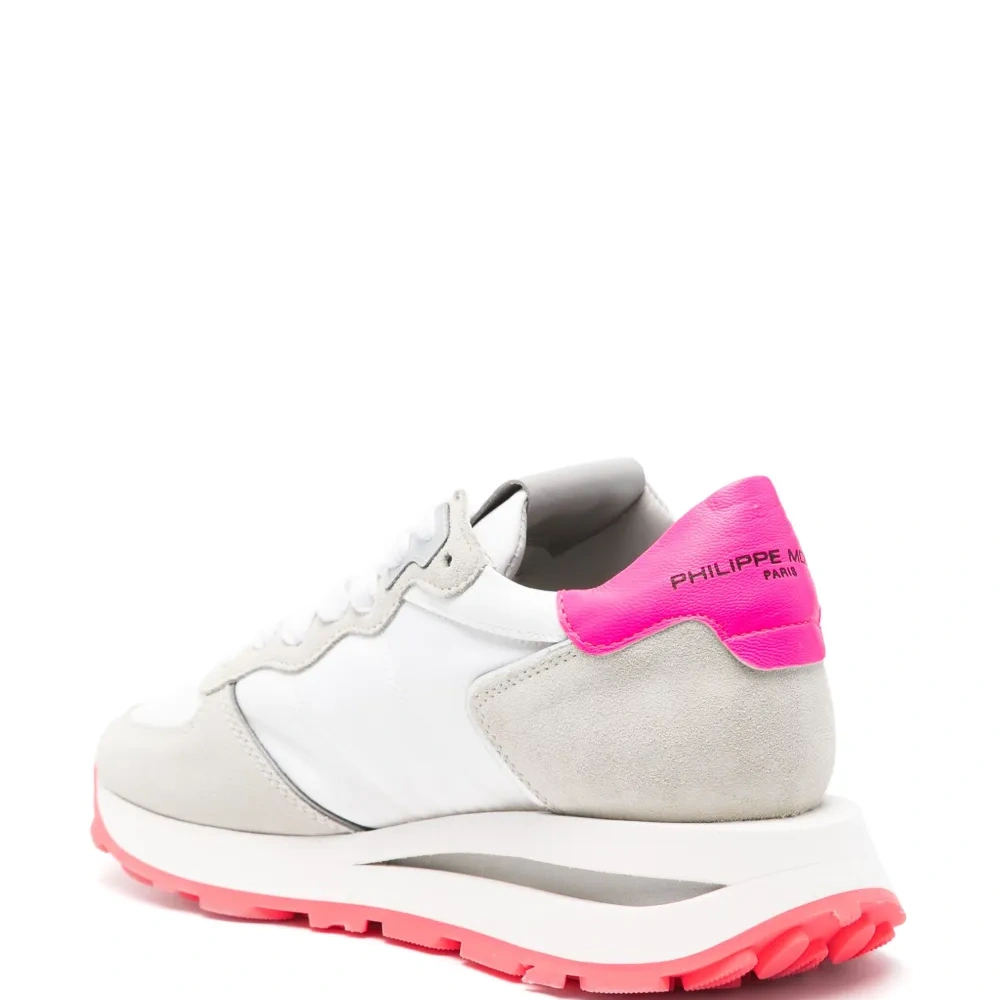 Фуксия, вставки, замшевые вставки, логотип сбоку, нашивка с логотипом на язычке, контрастный задник с логотипом, миндалевидный носок, шнуровка спереди, стелька с логотипом и массивная резиновая подошва.