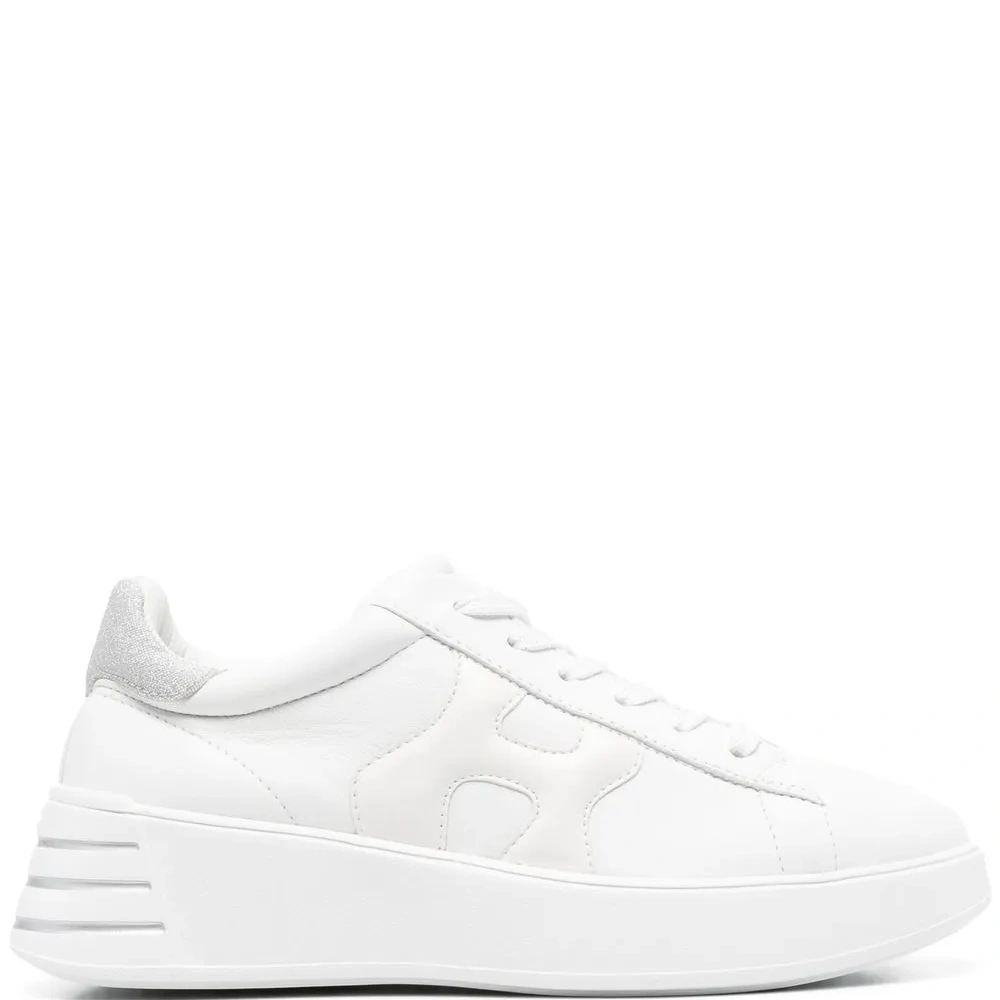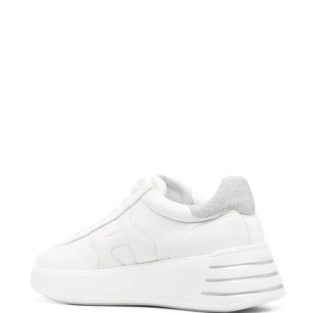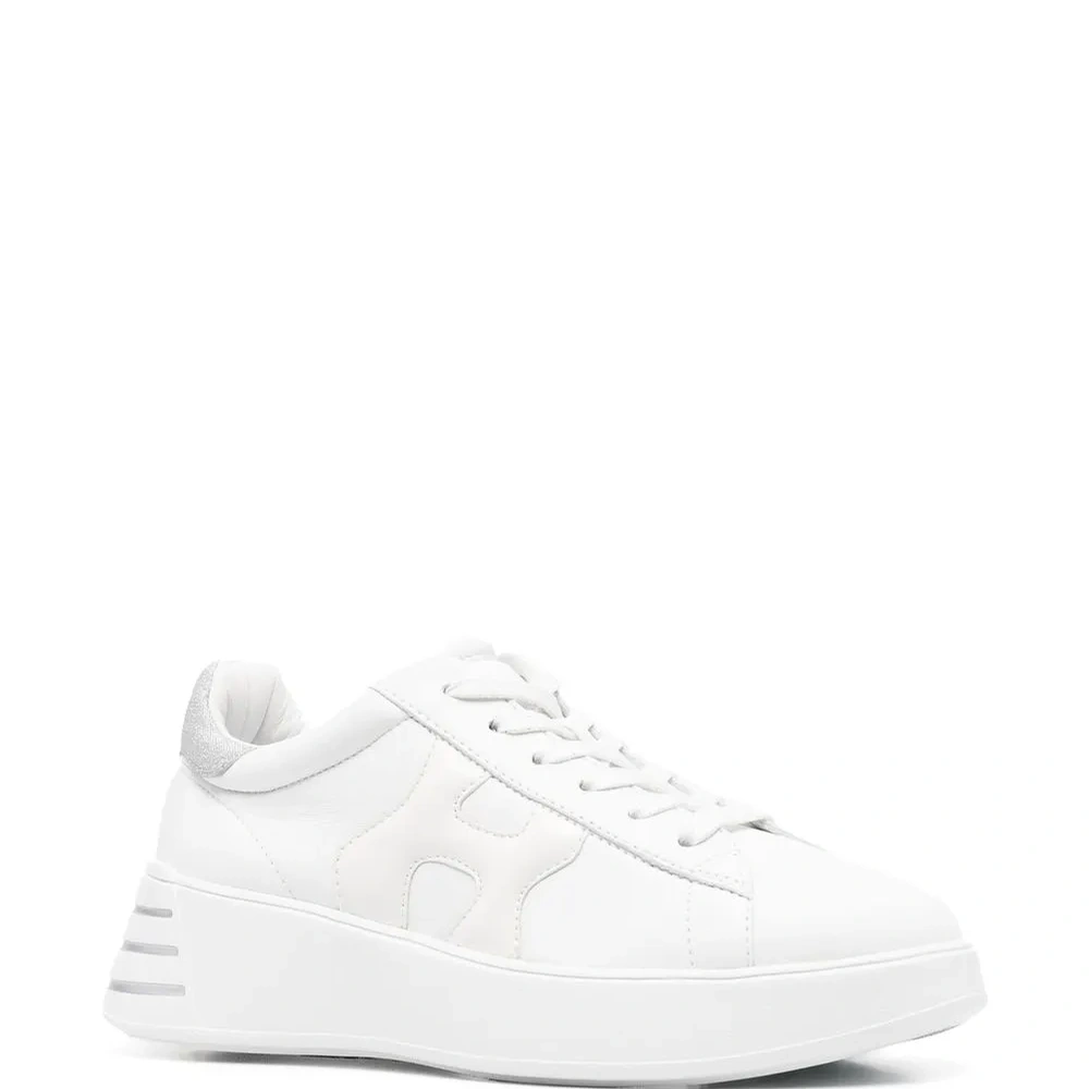 Белый, телячья кожа, нашивка с логотипом сбоку, люрекс, закругленный носок, шнуровка спереди, стелька с логотипом и подошва на платформе.