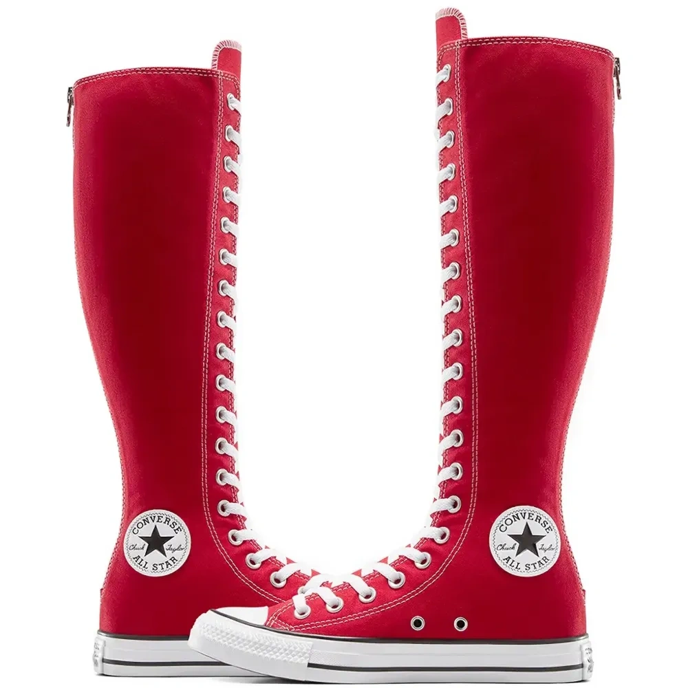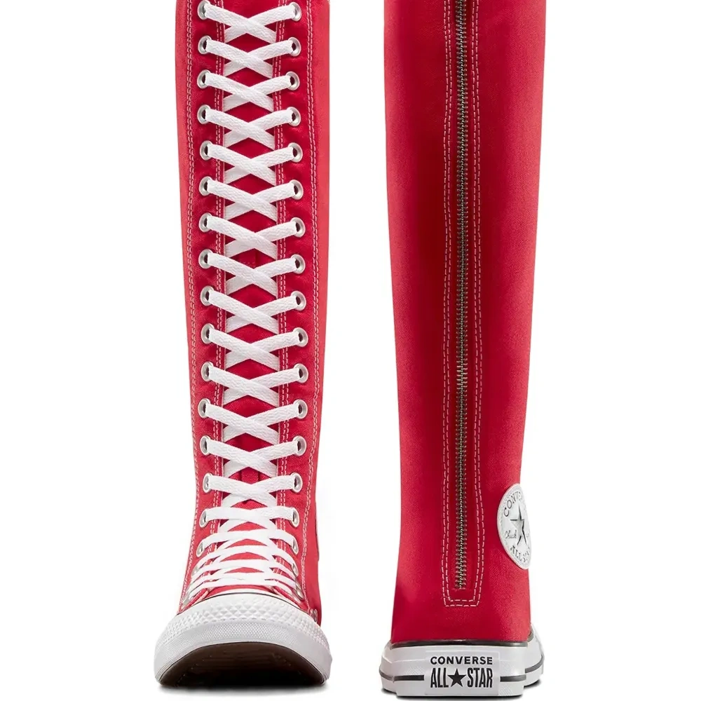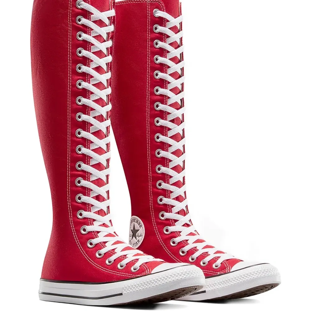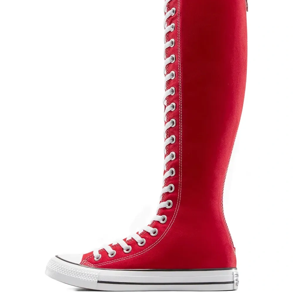красные высокие сапоги до колена на шнуровке, с застёжкой-молнией сзади, с нашивкой-логотипом, на резиновой подошве