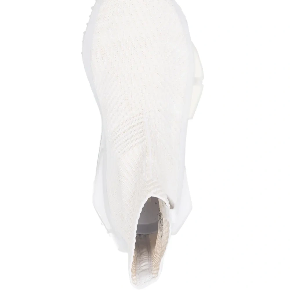 Белый, трикотаж в рубчик, закругленный носок, модель без застежки, стелька с логотипом, рифленая резиновая подошва и высота по щиколотку.