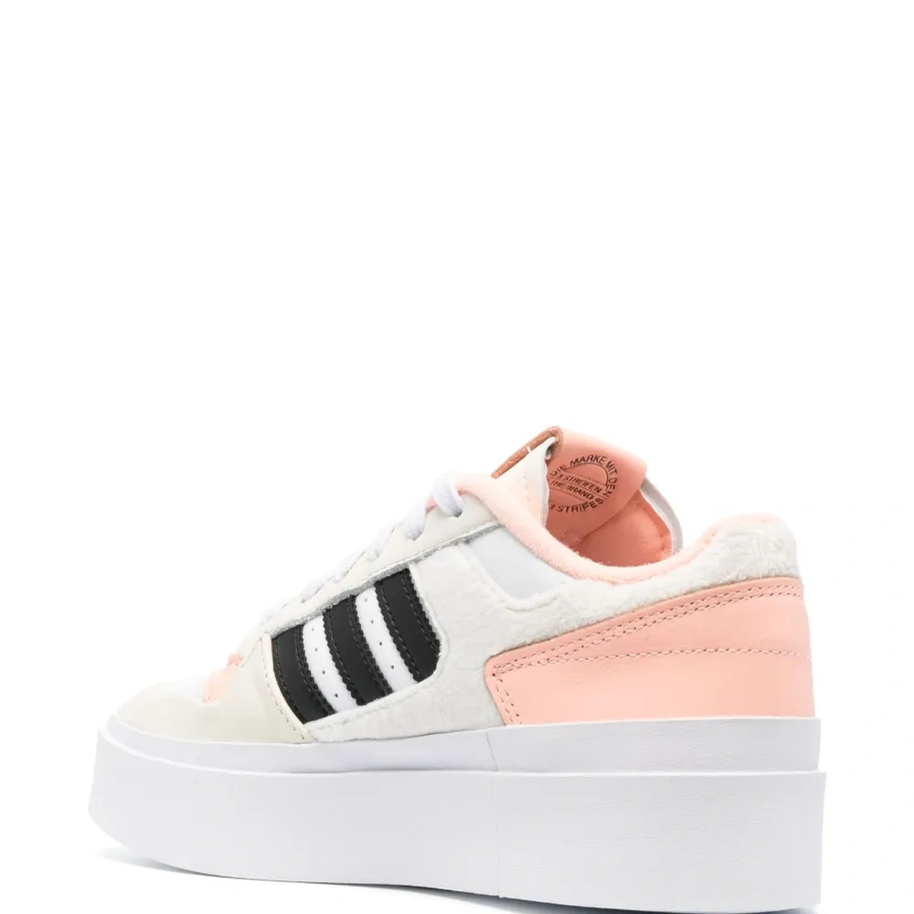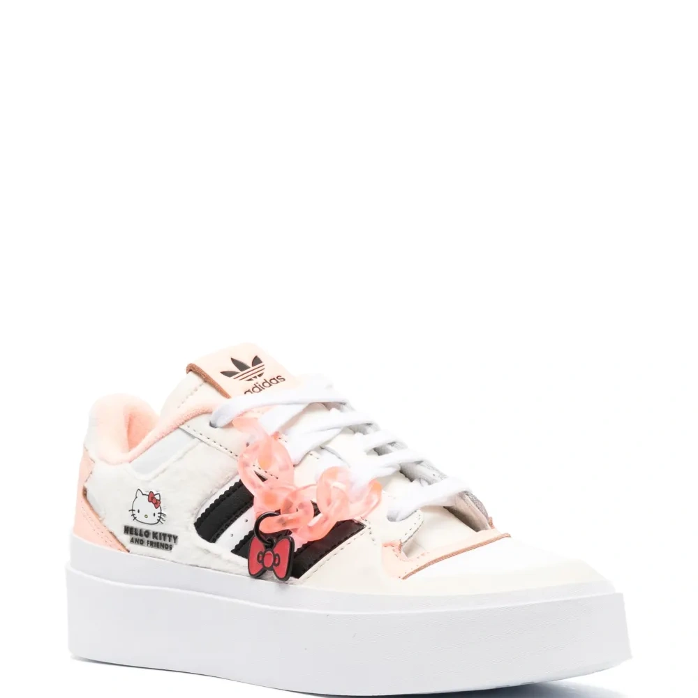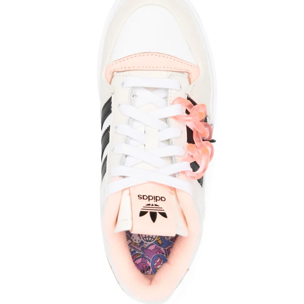Белый/разноцветный, телячья кожа, вставки, логотип-трилистник, знаковый логотип 3-Stripes, цепочка, подвеска в виде банта, нашивка с логотипом сбоку, нашивка с логотипом на язычке, закругленный носок, шнуровка спереди и массивная резиновая подошва.