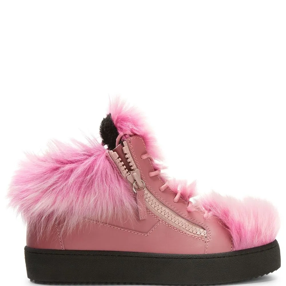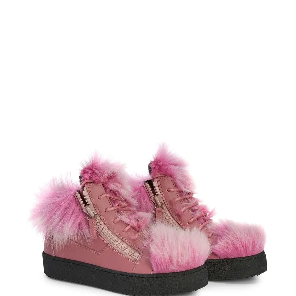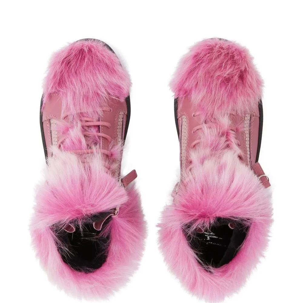 Ярко-розовый, кожа, подкладка из овечьей шерсти, отделка из искусственного меха, закругленный носок, шнуровка спереди, отделка с декоративной молнией, модель средней высоты и плоская резиновая подошва.