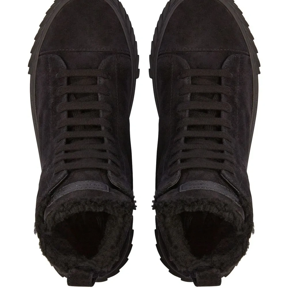 Черный, бархатный эффект, подкладка из искусственного меха, закругленный носок, шнуровка спереди, тисненый логотип на язычке, высота по щиколотку, плоская резиновая подошва и петля для подтягивания сзади.