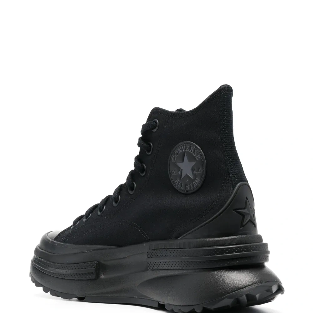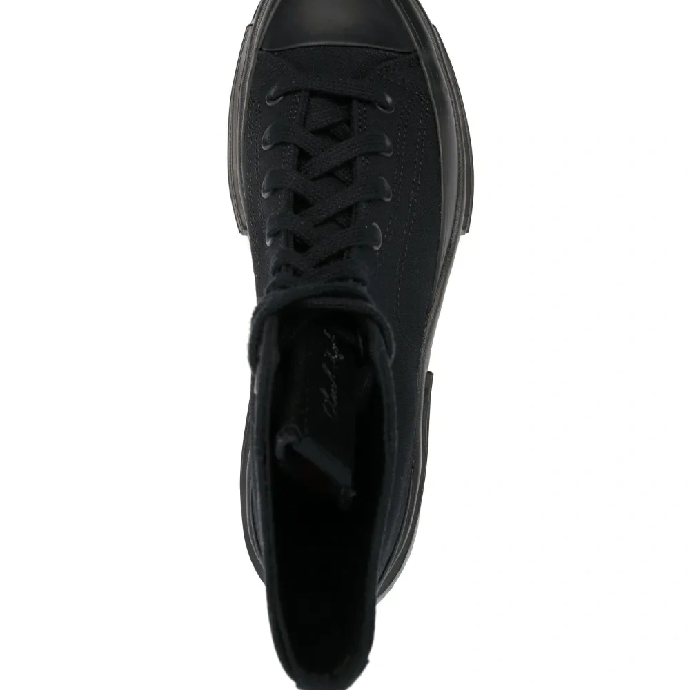 Черный, парусина, контрастный носок, закругленный носок, шнуровка спереди и массивная резиновая подошва.