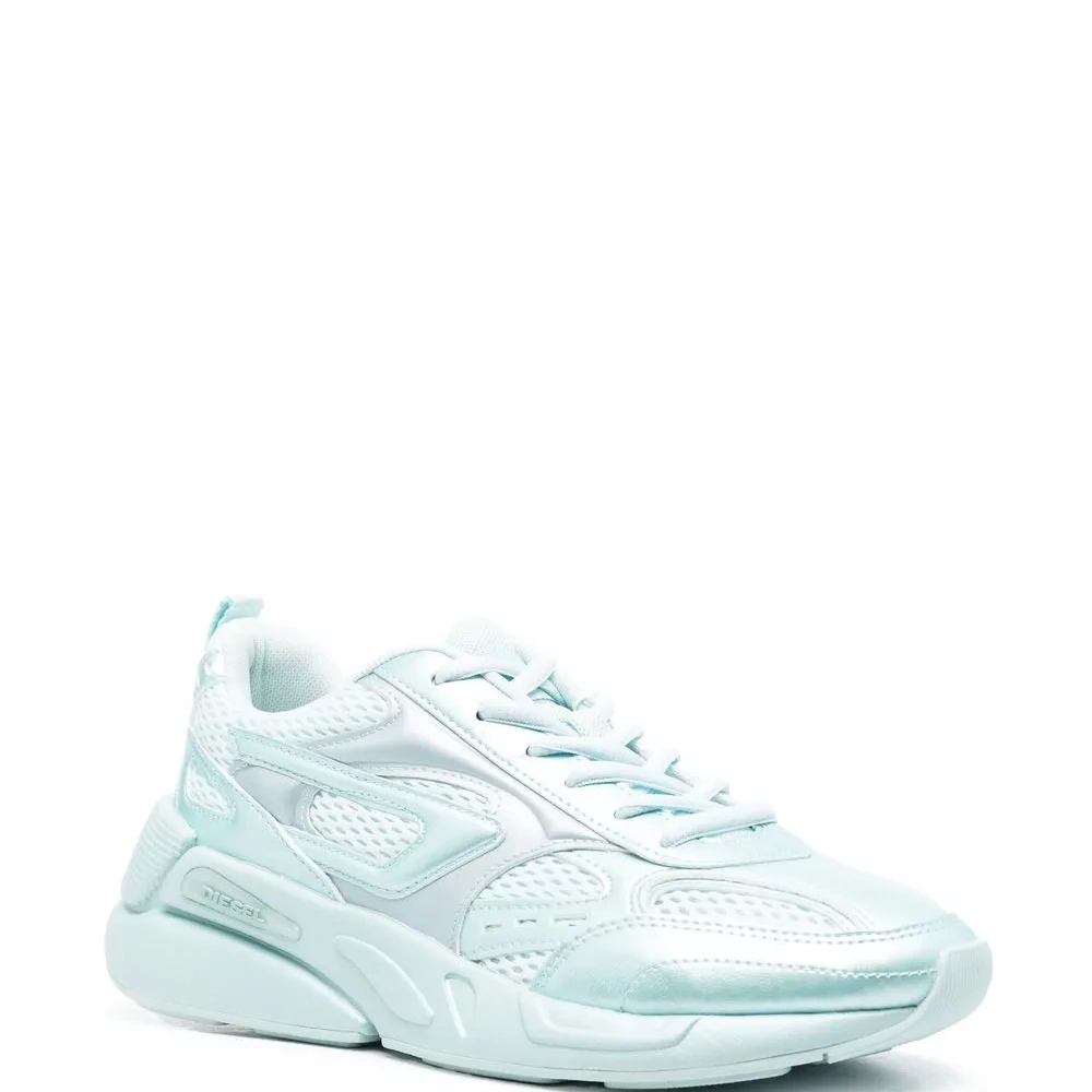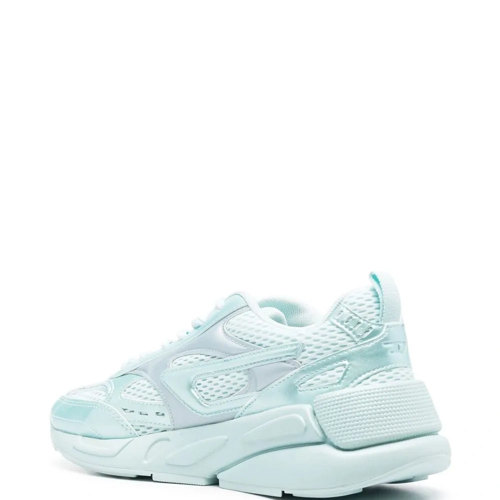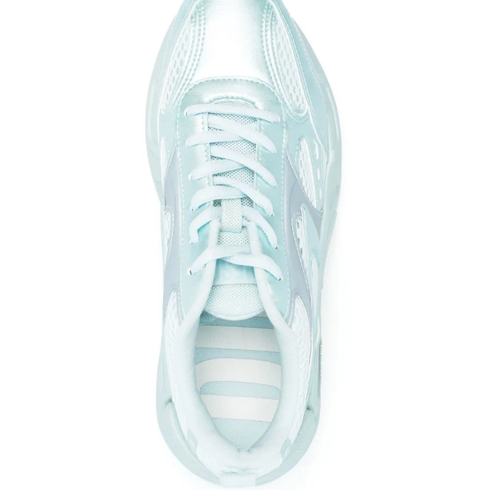 Пастельно-синий, искусственная кожа, сетчатые вставки, нашивка с логотипом сбоку, закругленный носок, шнуровка спереди, стелька с логотипом и рифленая резиновая подошва.