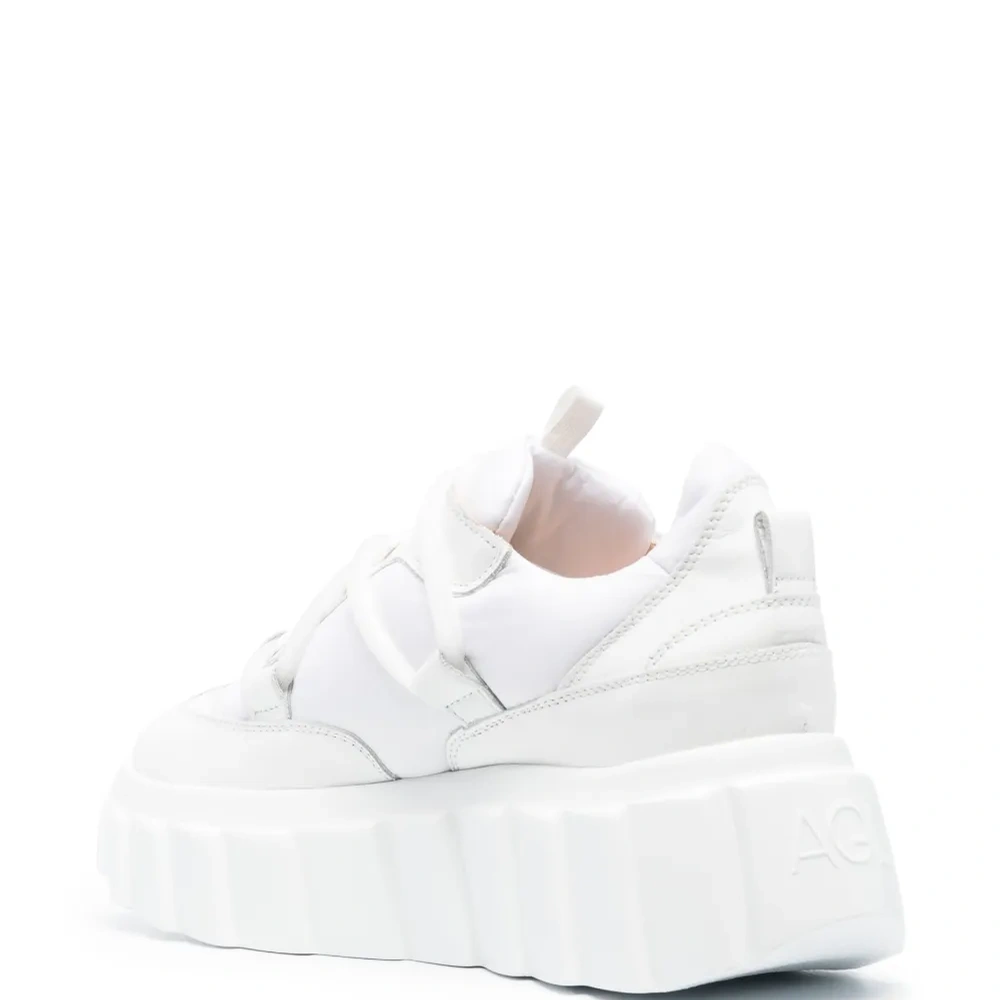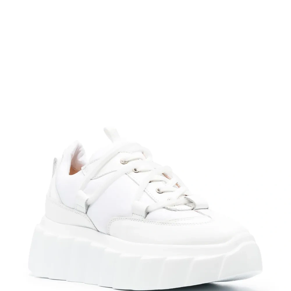 Белый, телячья кожа, однотонная расцветка, вставки, шнуровка спереди, стелька с логотипом, подошва на платформе и закругленный носок.