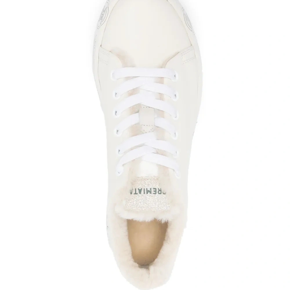 Кремовый, телячья кожа, подкладка из овечьей шерсти, закругленный носок, нашивка с логотипом на язычке, логотип на подошве, контрастный задник с логотипом, шнуровка спереди и плоская резиновая подошва.