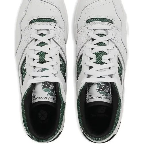 белые кроссовки с зелёными вставками, логотипом, шнуровкой и плоской подошвой