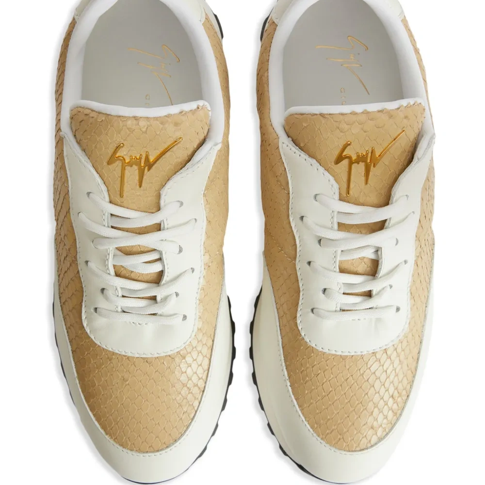 Бежевый, кожа, металлический логотип на язычке, эффект змеиной кожи, миндалевидный носок, стелька с логотипом и плоская резиновая подошва.
