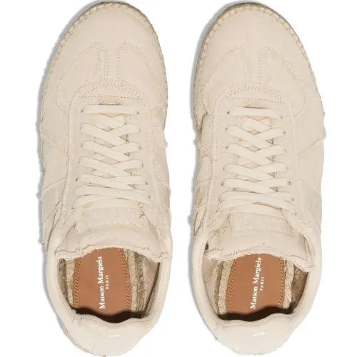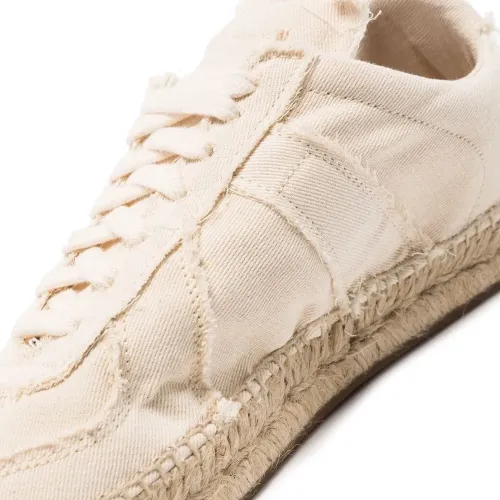 Кремовый, кожа, парусина, знаковый логотип-стежок, необработанные края, закругленный носок, шнуровка спереди и плетеная подошва из рафии.