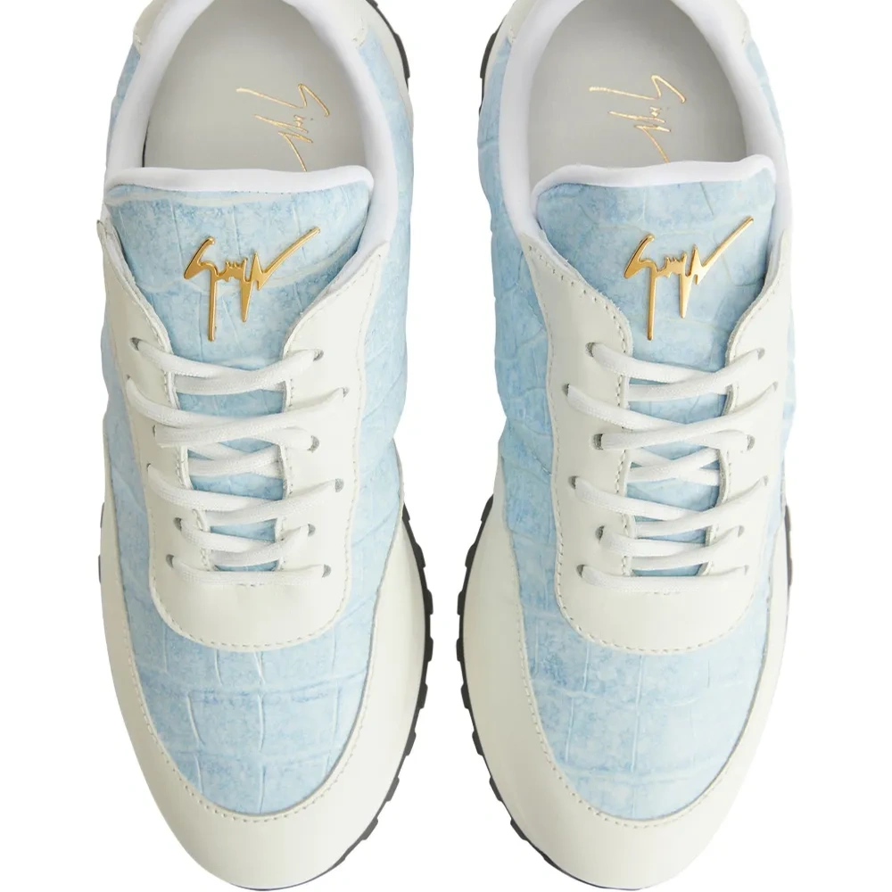 Голубой, цвет слоновой кости, кожа, тиснение под кожу крокодила, вставки, золотистый металлический логотип, металлический логотип на язычке, закругленный носок, шнуровка спереди, задник с логотипом, стелька с логотипом и рифленая резиновая подошва.